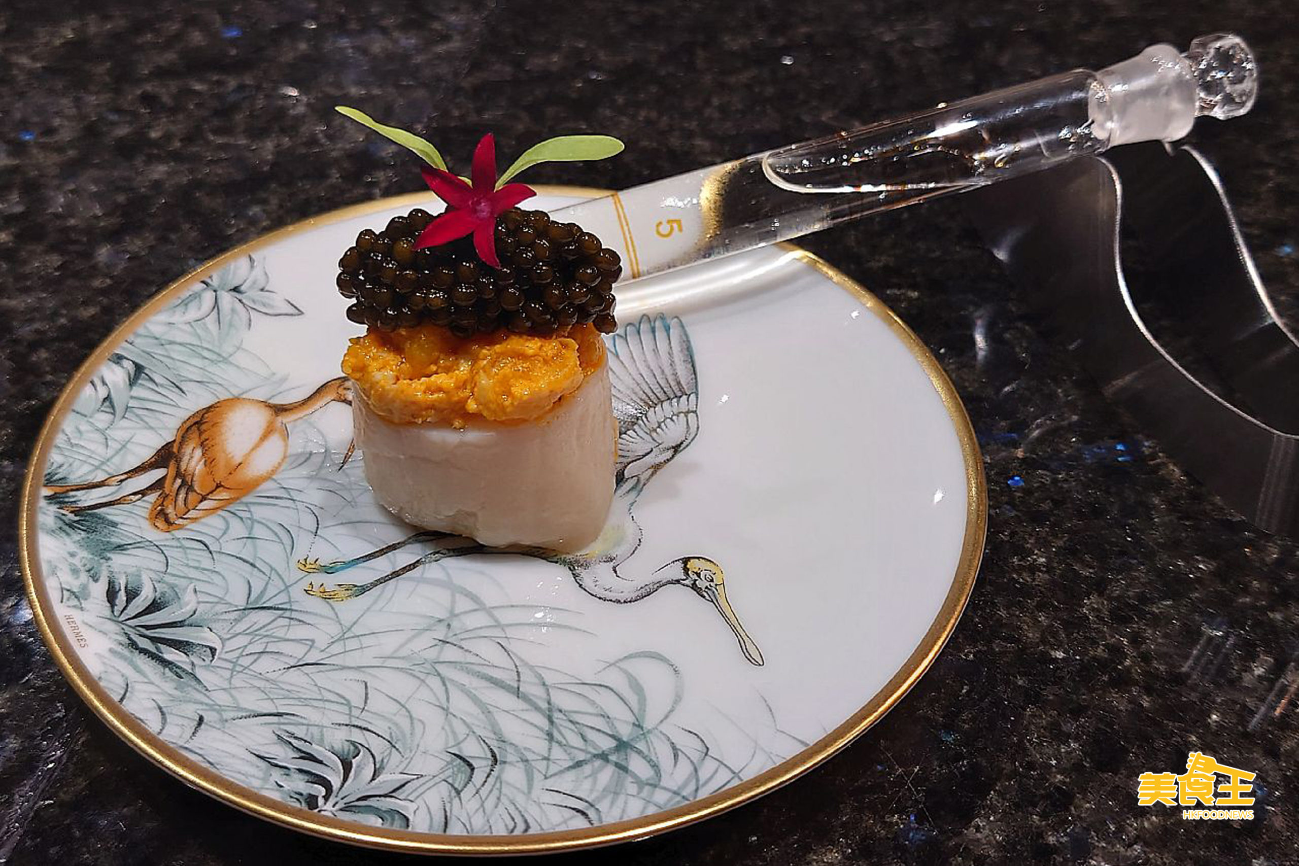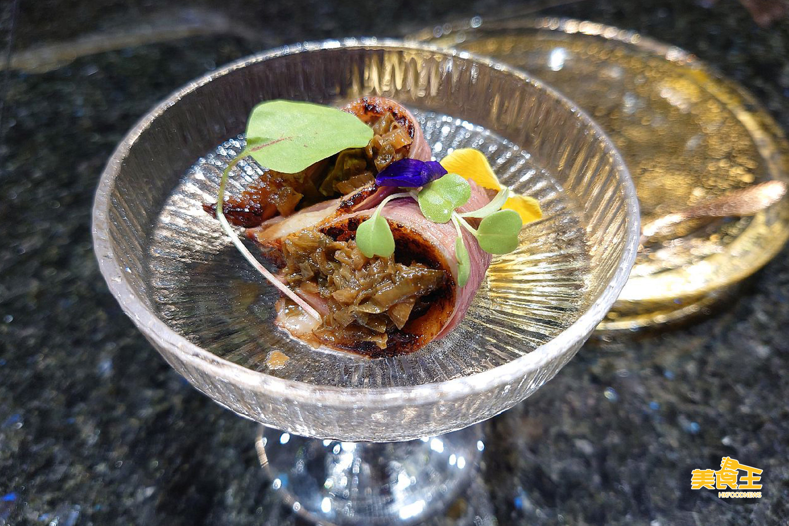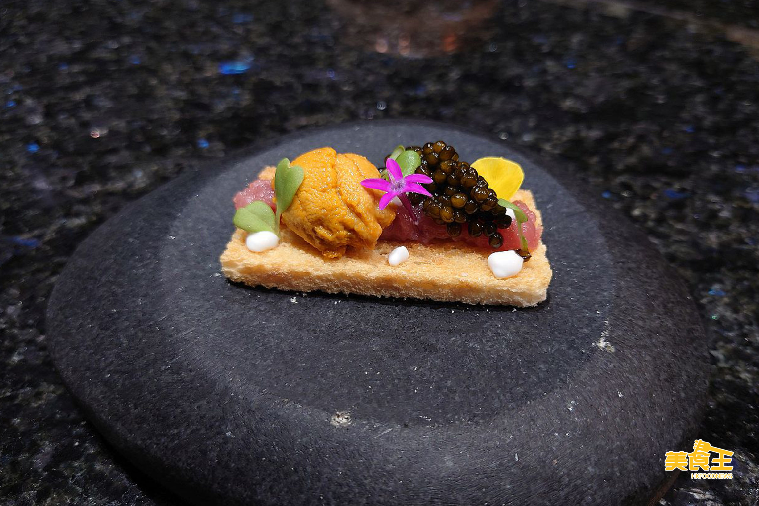 先來前菜的「拖羅海膽」,把拖羅配上海膽、魚子醬,加上忌廉芝士,放於脆口的多士上,色澤奪目,且伴以食用花來裝飾,確是如 Thomas 所說的把食物變成藝術品一樣的吸引。