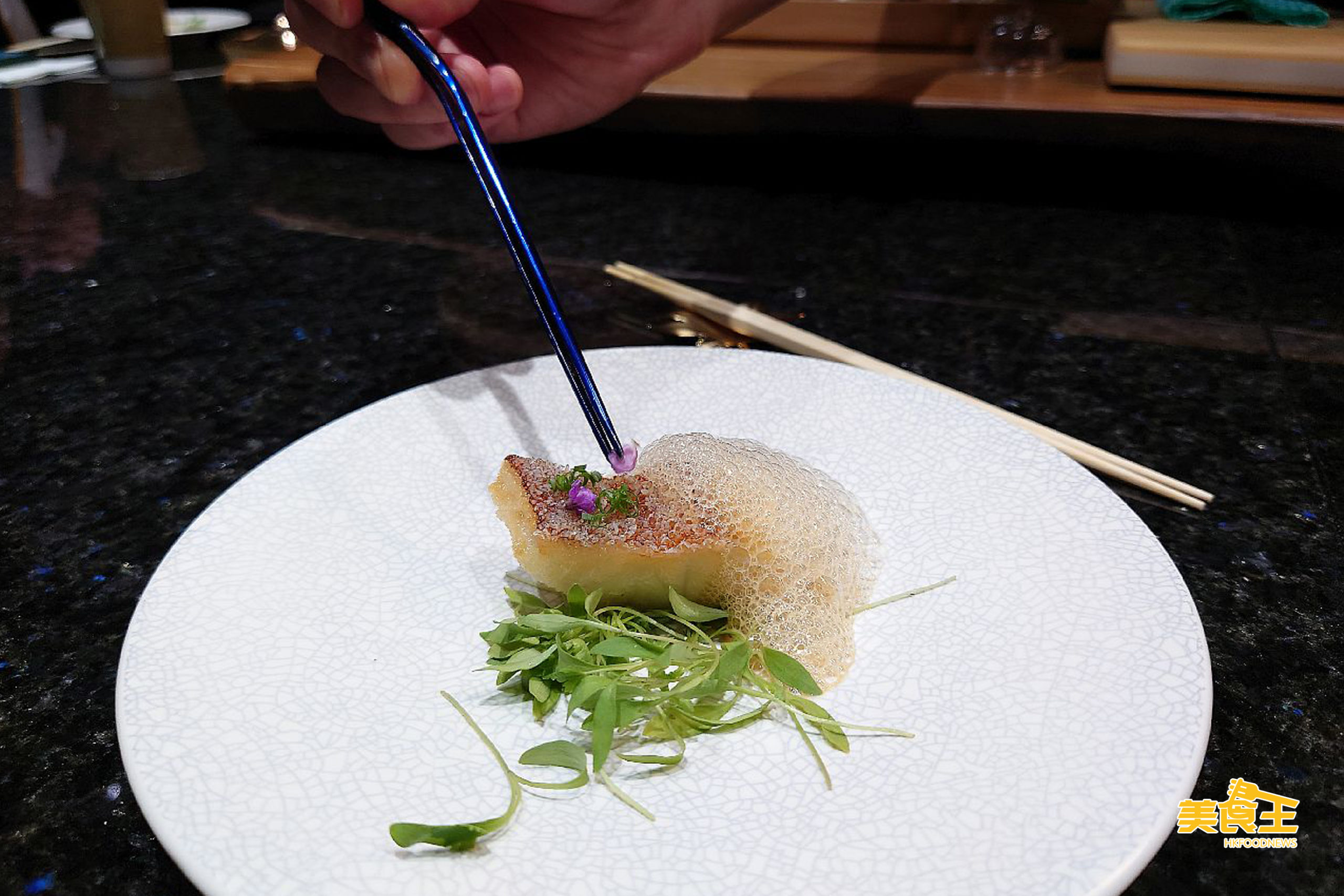 於日菜本中常見以鯛魚來做立鱗,但鯛魚鱗及肉質也較厚,故 Thomas 改用日本東星斑以 160 度滾油煎製成「香煎脆皮東星」,入口外脆內軟,伴以牛蒡汁、忌廉、大豆卵磷脂做成的泡泡,因加入空氣,濃度、質感不似一般汁那般濃膩,令易吃到東星斑原有的鮮甜味。