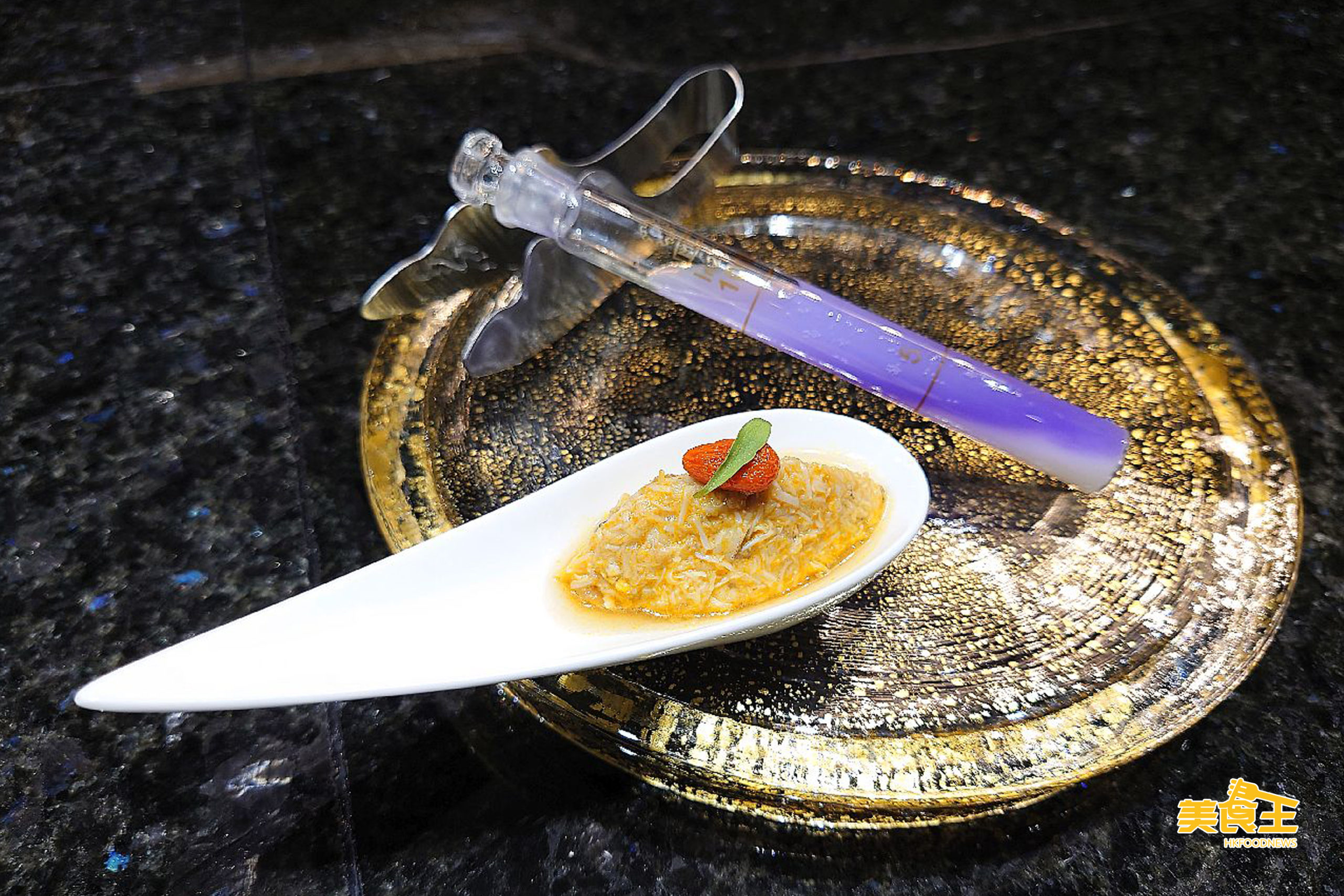 店內亦推出大閘蟹菜式 (供應期到 12 月中),以精選的約重 5 両半、半公半母的蘇州大閘蟹自家拆肉煮製出多款限時菜式,但要一讚的,是大廚為了讓大家有更佳的味覺享受,故其中 3 道的特別大閘蟹菜式會配上指定的 3 款酒品同時享用,且以「試管」代替杯子,視覺上更搶眼,食客打卡時亦更覺好玩。