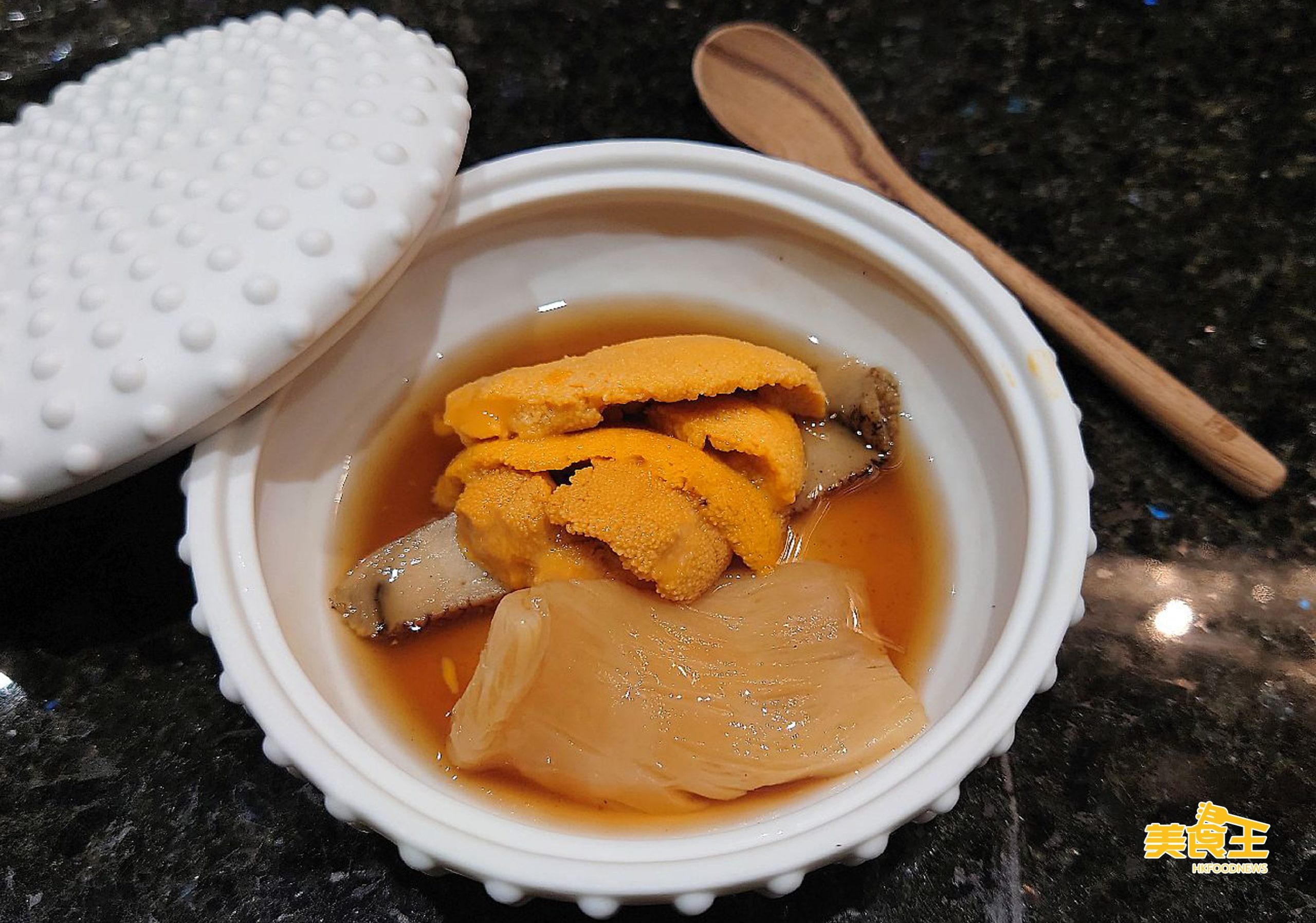 另一道像是中日聯乘的菜餚是「昆布鮑魚、花膠配海膽」,先以日本真蠔、昆布去煮製澳鮑魚令其軟腍入味,另選用「4 頭花膠」以自蒸後用冰水的方法去浸泡 3 次,故可保留更多膠質,最後再加上海膽,並以木魚汁吊味,確是有點吃得奢華的感覺。
