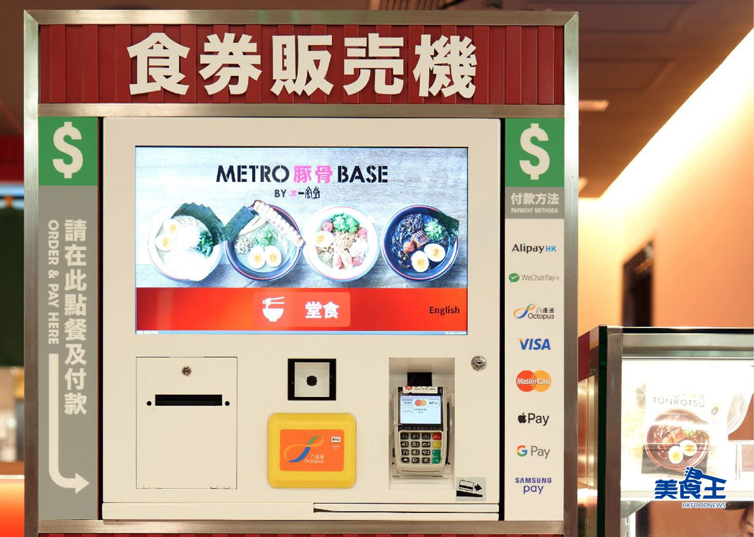 「METRO 豚骨 BASE」選址於同為鐵路沿線的九龍灣德福廣場,新店設有 35 個座位;至於顧客來都要使用門口的自助點餐機進行點餐,付款支援各種電子付費系統。