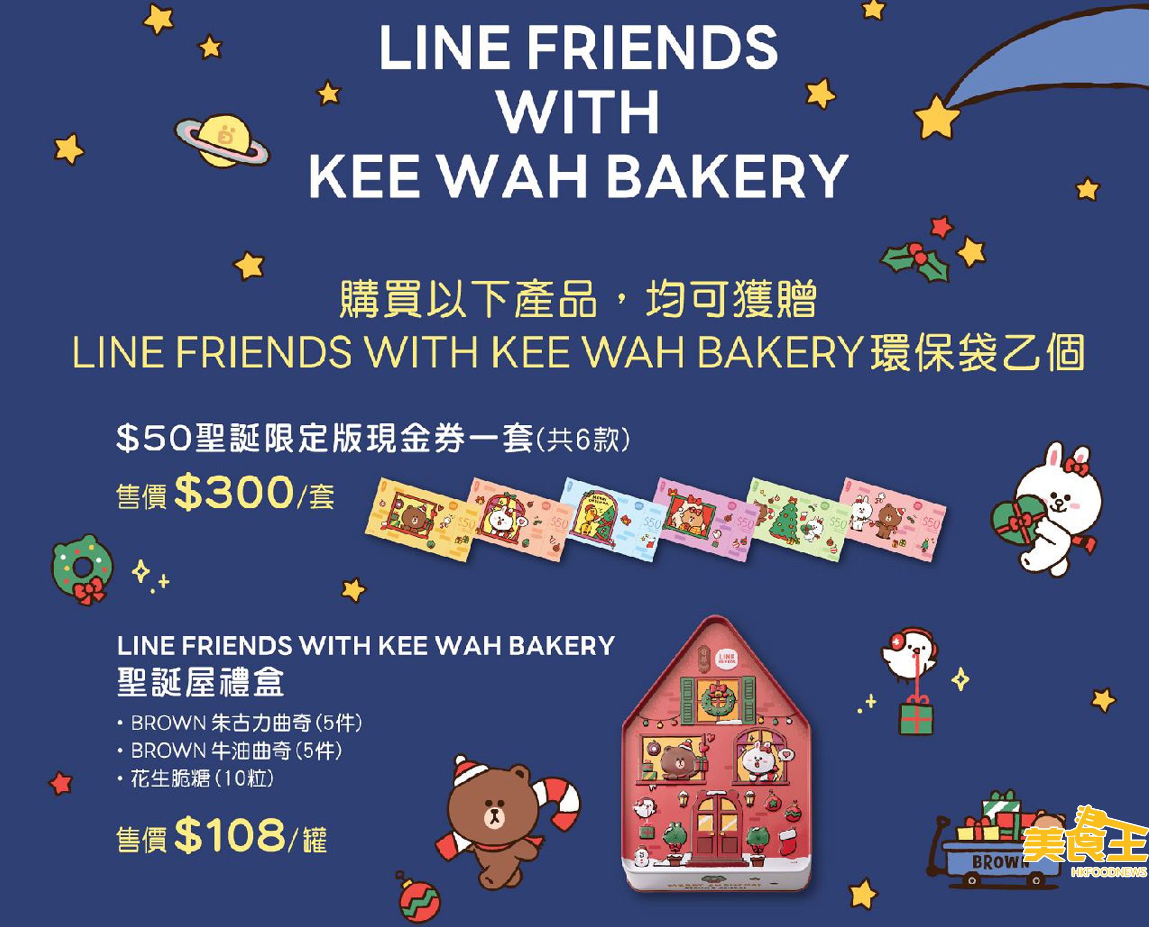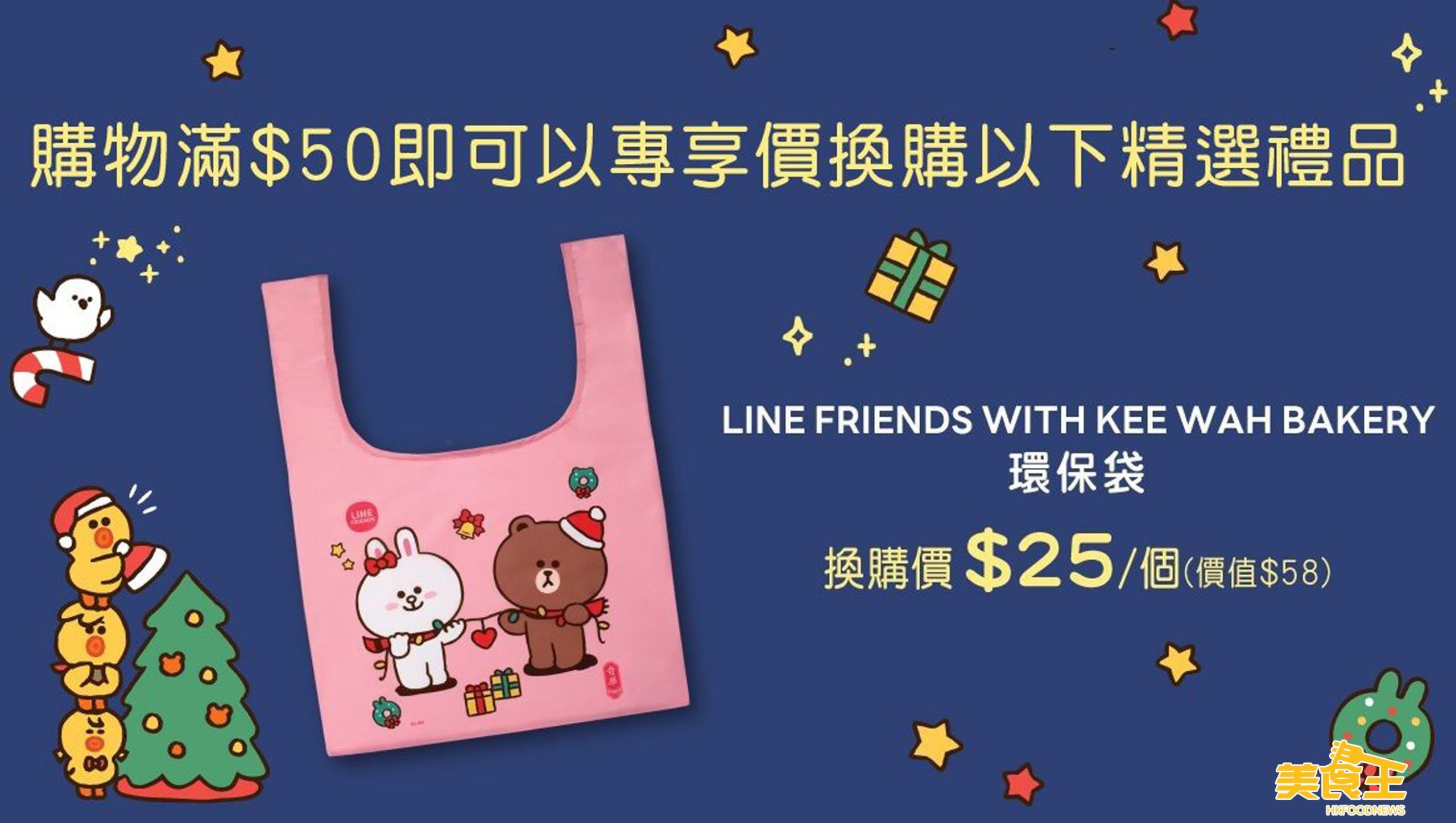 顧客於即日至 12 月 25 日期間到奇華餅家全線分店 (香港國際機場分店除外) 購買任何奇華產品滿 $50,即可以尊享價 $25 (價值 $58) 換購「Line Friends With Kee Wah Bakery 環保袋」乙個。禮品數量有限,勿失良機!