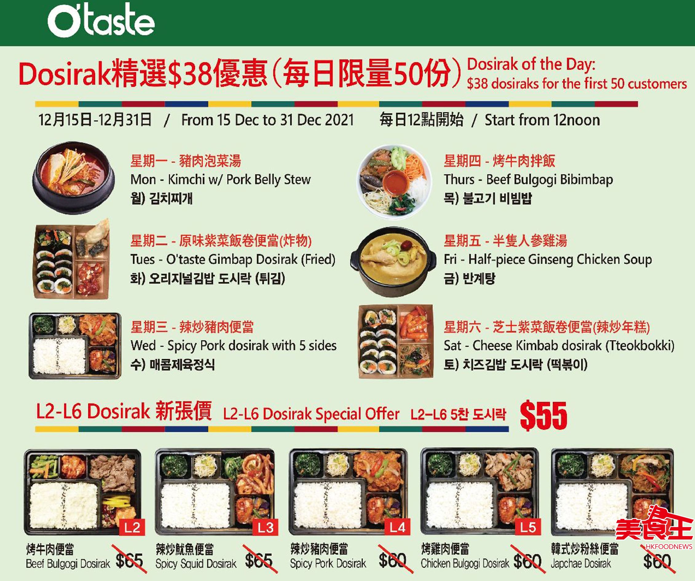 1. O’taste 指定 Dosirak(韓式便當) 優惠價每日限量發售 (至 12 月 31 日):逢星期一至六,每日指定特選 Dosirak 以優惠價$38 發售,每日中午 12 日開始發售,限量 50 份;指定特色 Dosirak 以新張價 $55 發售 (原價 $60-$65)。