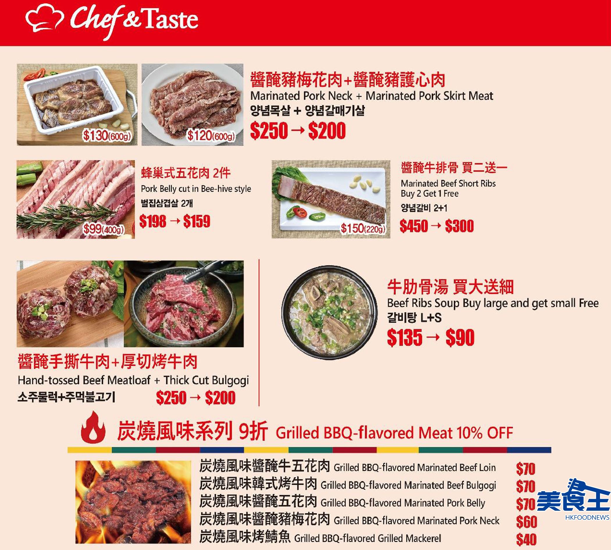 2. Chef & Taste 韓式烤肉優惠:指定炭燒風味系列肉品 9 折優惠價發售;其他指定韓式烤肉以優惠價發售。