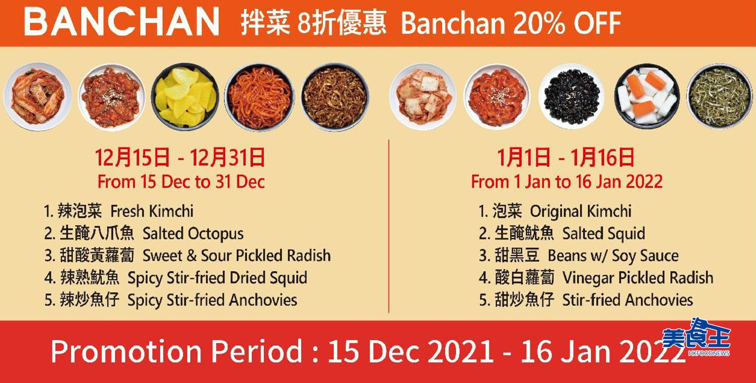3. Banchan 伴菜優惠:期間限定指定伴菜款式 8 折優惠價發售;購買任何 3 款以上伴菜可享 9 折優惠 (優惠不適用於 8 折優惠產品、韓方豬手及醬油蟹)。