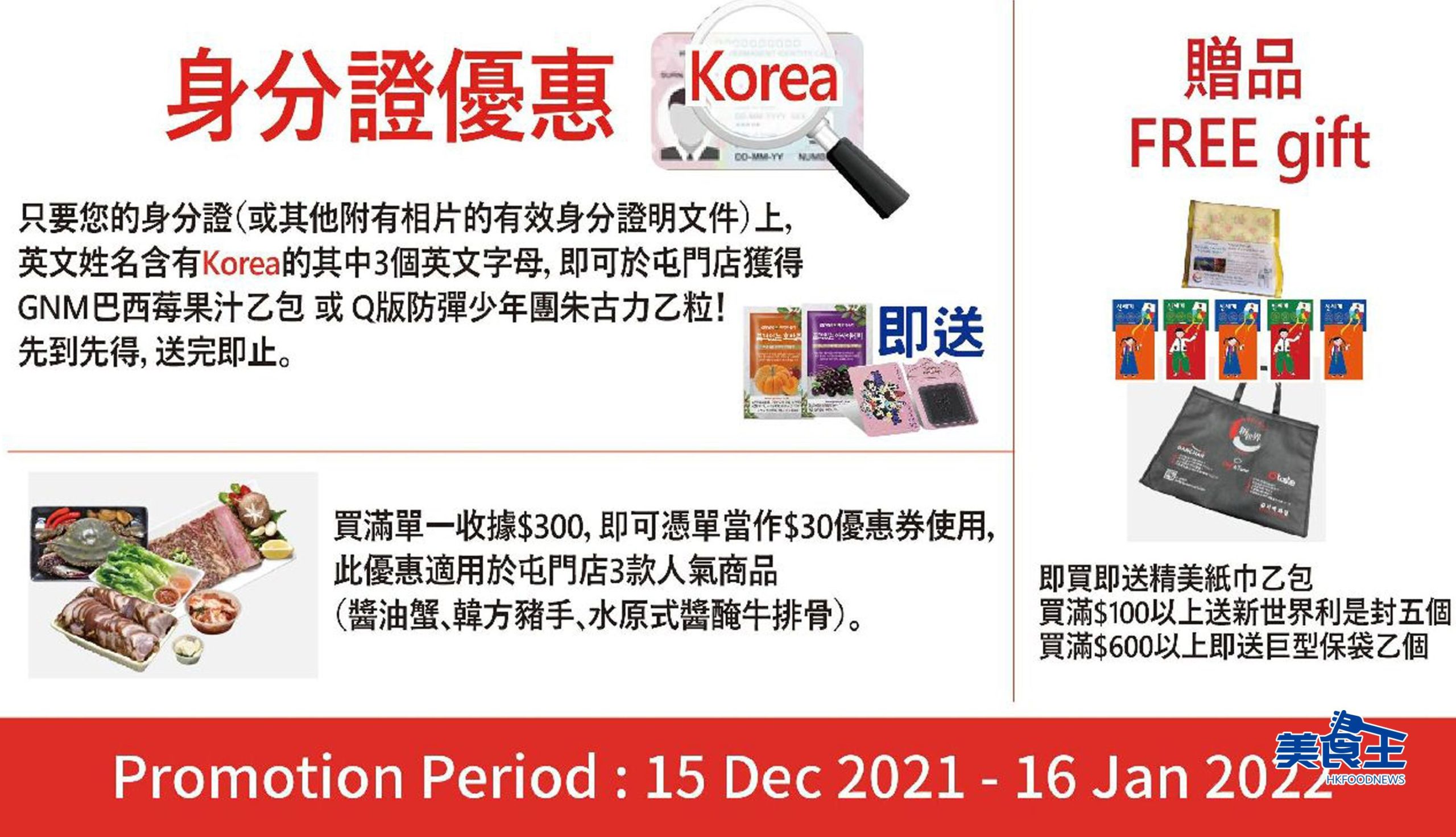 為了慶祝全新新界西首間分店於「錦薈坊」開幕,新世界韓國食品屯門店由即日至 2022 年 1 月 16 日特別推出一系列開幕限定優惠,當中包括: