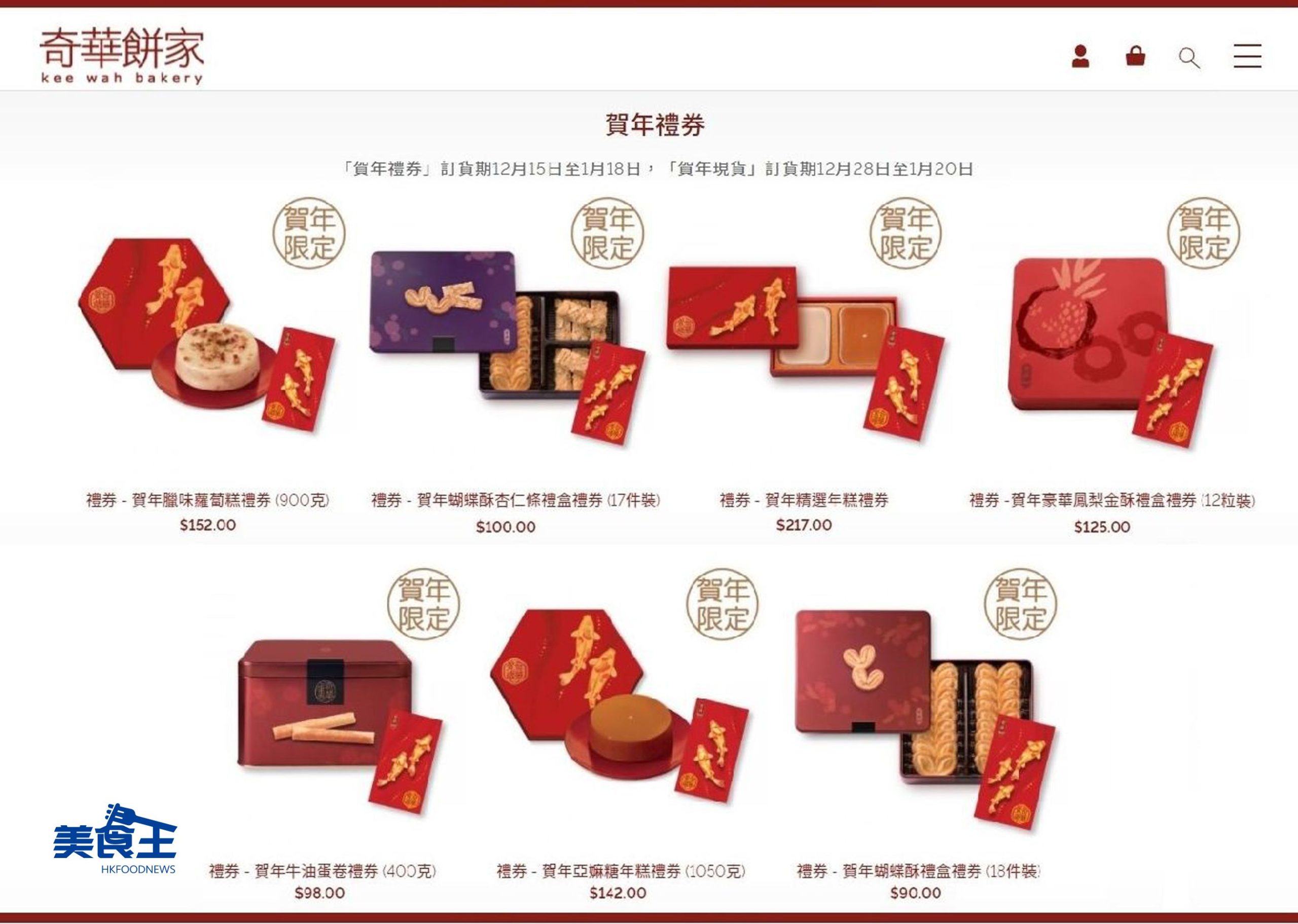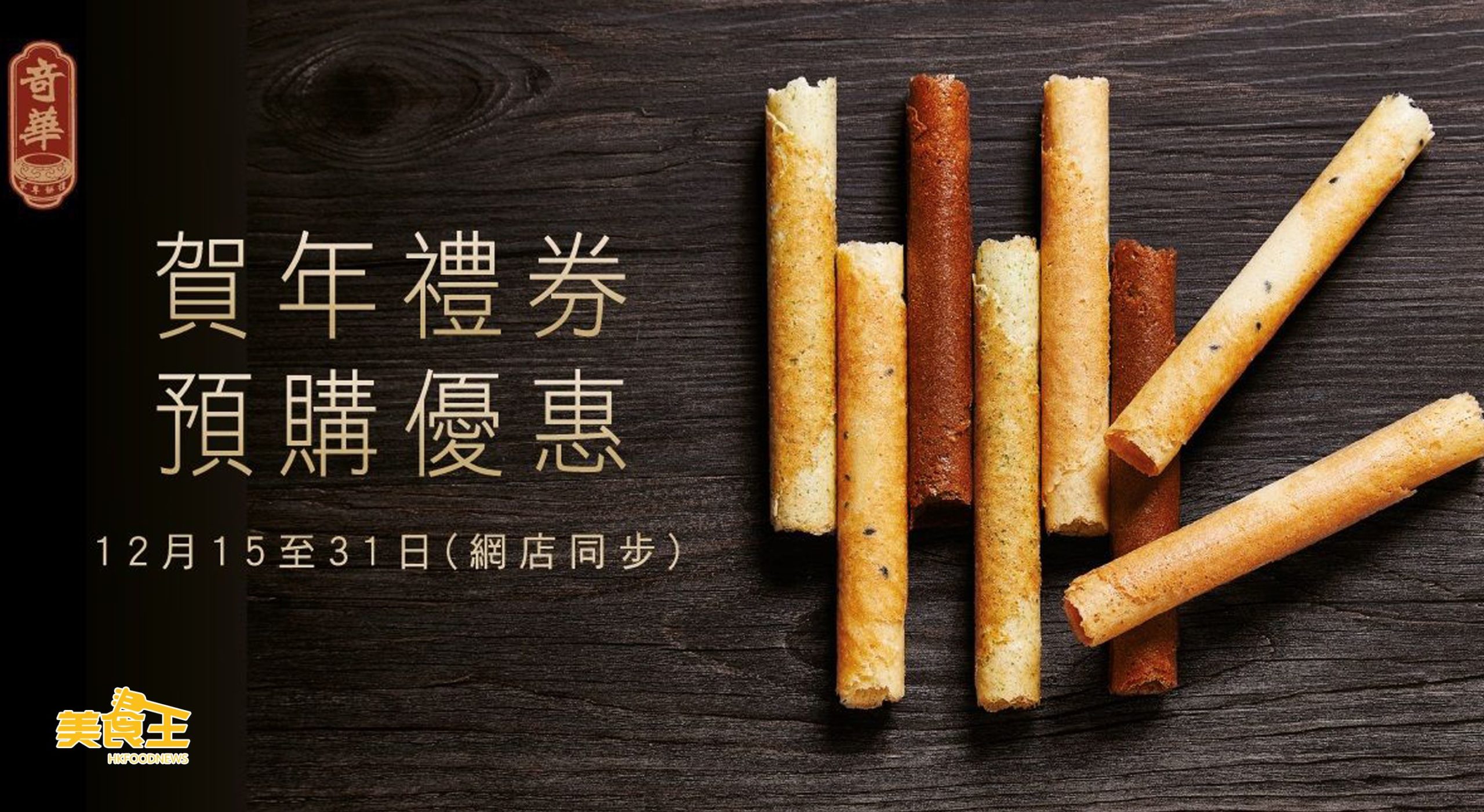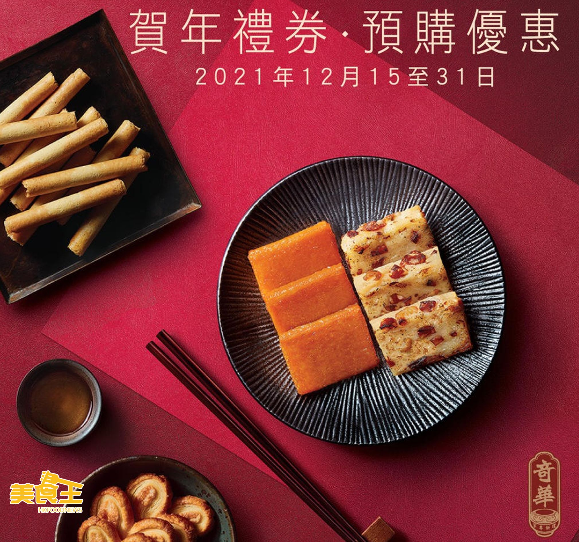 冬至快將來臨,虎年亦快走近。為方便大家迎新歲辦年貨作準備,奇華餅家門市及網店同步特設限時「早鳥優惠」,除了必備的「臘味蘿蔔糕」、「亞嫲糖年糕」等經典傳統賀年糕點外,亦更增設包括「鳳梨金酥」、「蝴蝶酥」、「杏仁條」等多款滋味餅食禮券;大家可於 12 月底前使用「早鳥優惠」選購有關產品。