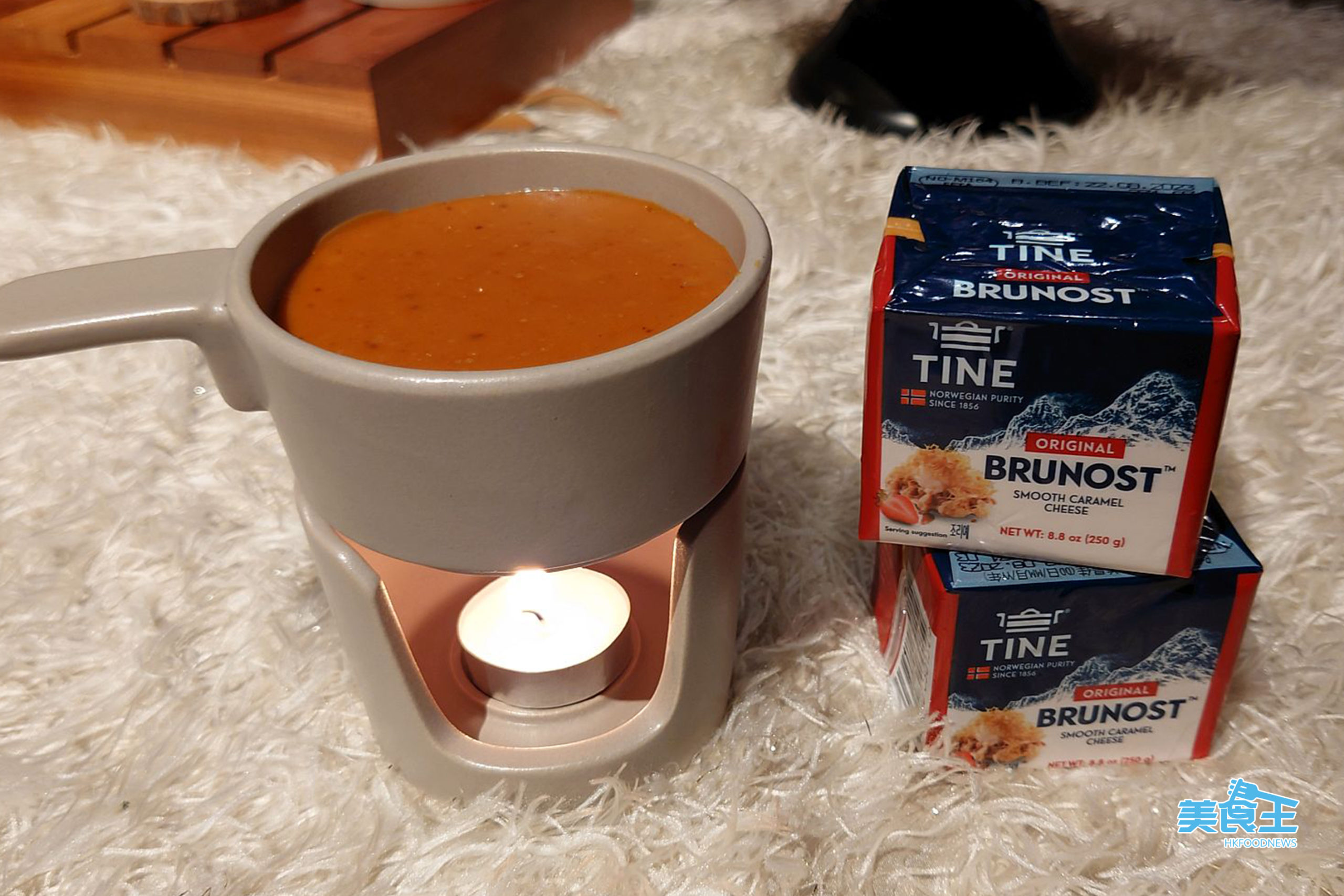 焦糖芝士採用當地頂級牛奶和羊奶混合製作,起源可追溯至 1863 年的挪威 Gudbrandsdalen 村莊。在生產過程中,首先會分離出製作傳統芝士的凝乳並留起乳清,然後將乳清加熱並加入濃厚的原乳;透過把原材料混合並加熱,糖份進一步分解及焦糖化,慢慢結出焦糖的質感,味道亦比其他芝士香甜及濃郁;而加熱的時間越長,製成的芝士顏色亦會越深。接下來挪威焦糖芝士的半成品會被分批放涼,令當中的天然乳糖結晶化;這個過程須在嚴格的監管下進行,以確保糖份結晶不會過快,影響其幼滑的質感。