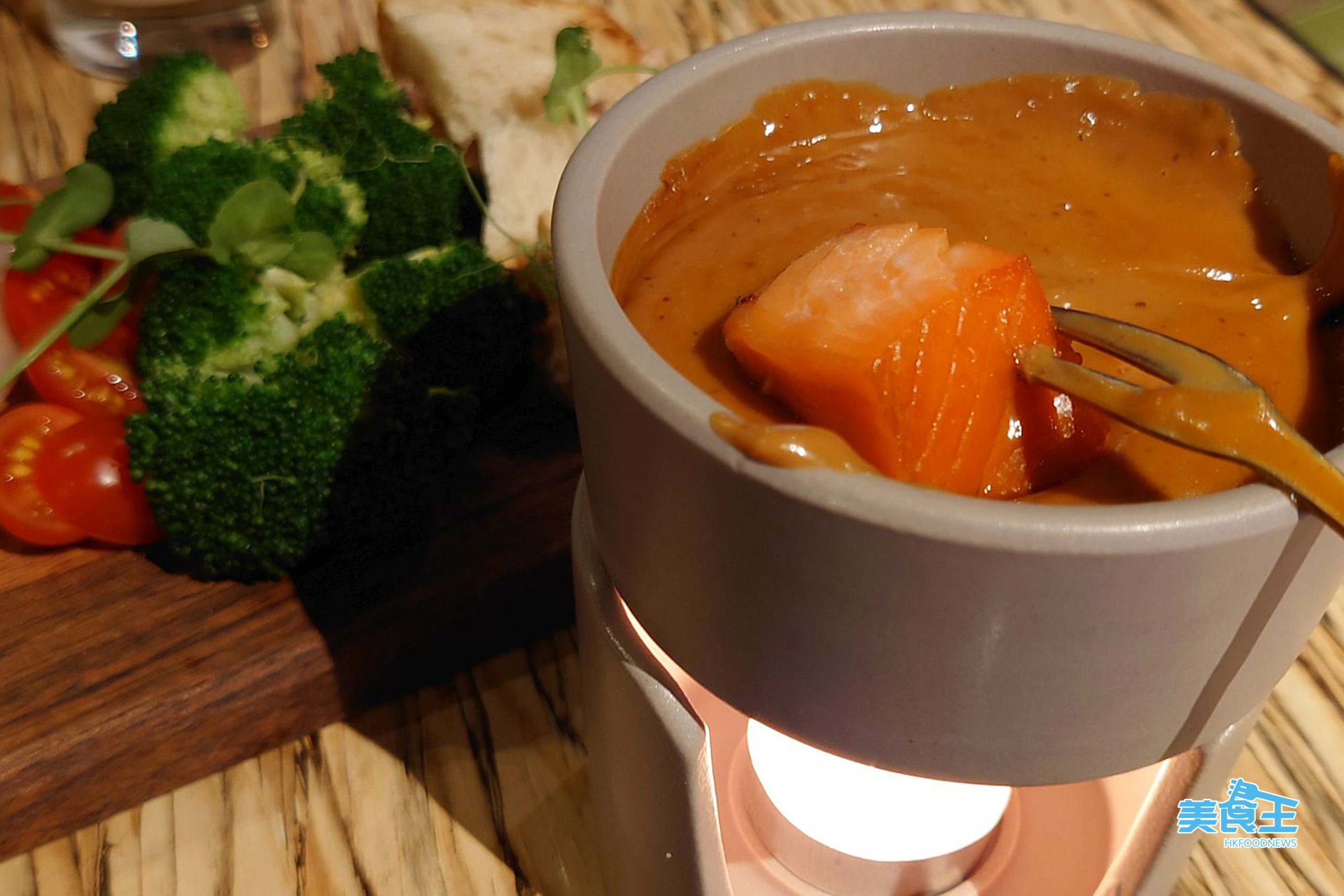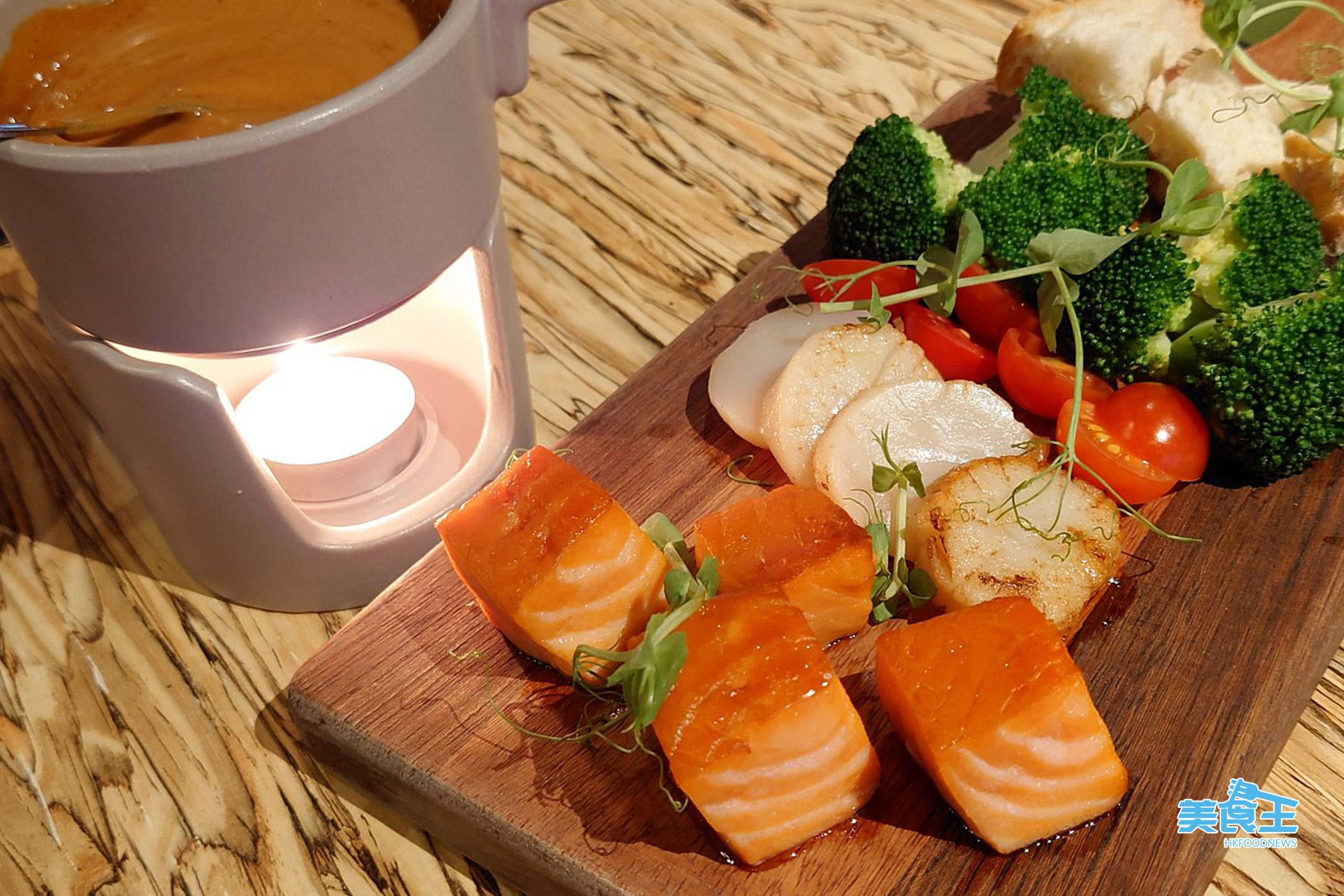 FINDS 貼心為每位客人送上個人專屬的芝士火鍋以供獨享,鹹點配料則創新地選用自家煙燻挪威三文魚及輕煎北海道帶子,烹調後帶點鹹香,與焦糖芝士的甜味實屬天作之合;其他配料還有西蘭花、車厘茄、番薯條及酸種麵包,都很適合用來醮半溶且味道較濃香的焦糖芝士同吃,惹味之餘也保留了食材原有的鮮甜味道。