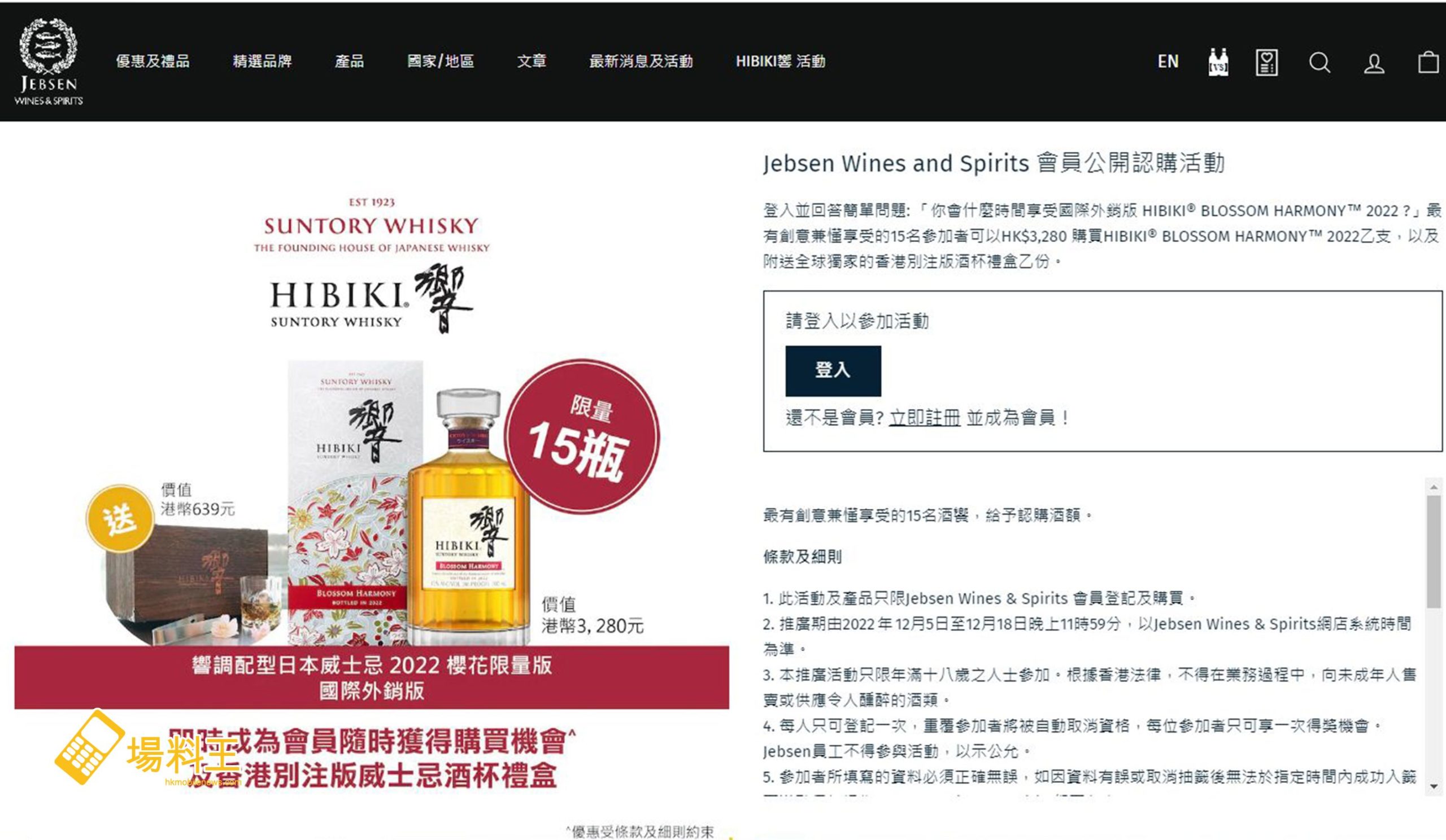 免費登記成為 JWS.com 會員,由即日至 12 月 18 日 23 時 59 分,只要就指定問題「你會在什麼時間享受國際外銷版 HIBIKI BLOSSOM HARMONY 2022」作答後,JWS.com 選出最有創意兼懂享受的 15 名酒饗,給予認購酒額。直接認購網址如下:https://www.jebsenwinesandspirits.com/zh/pages/hibiki-campaign-2022