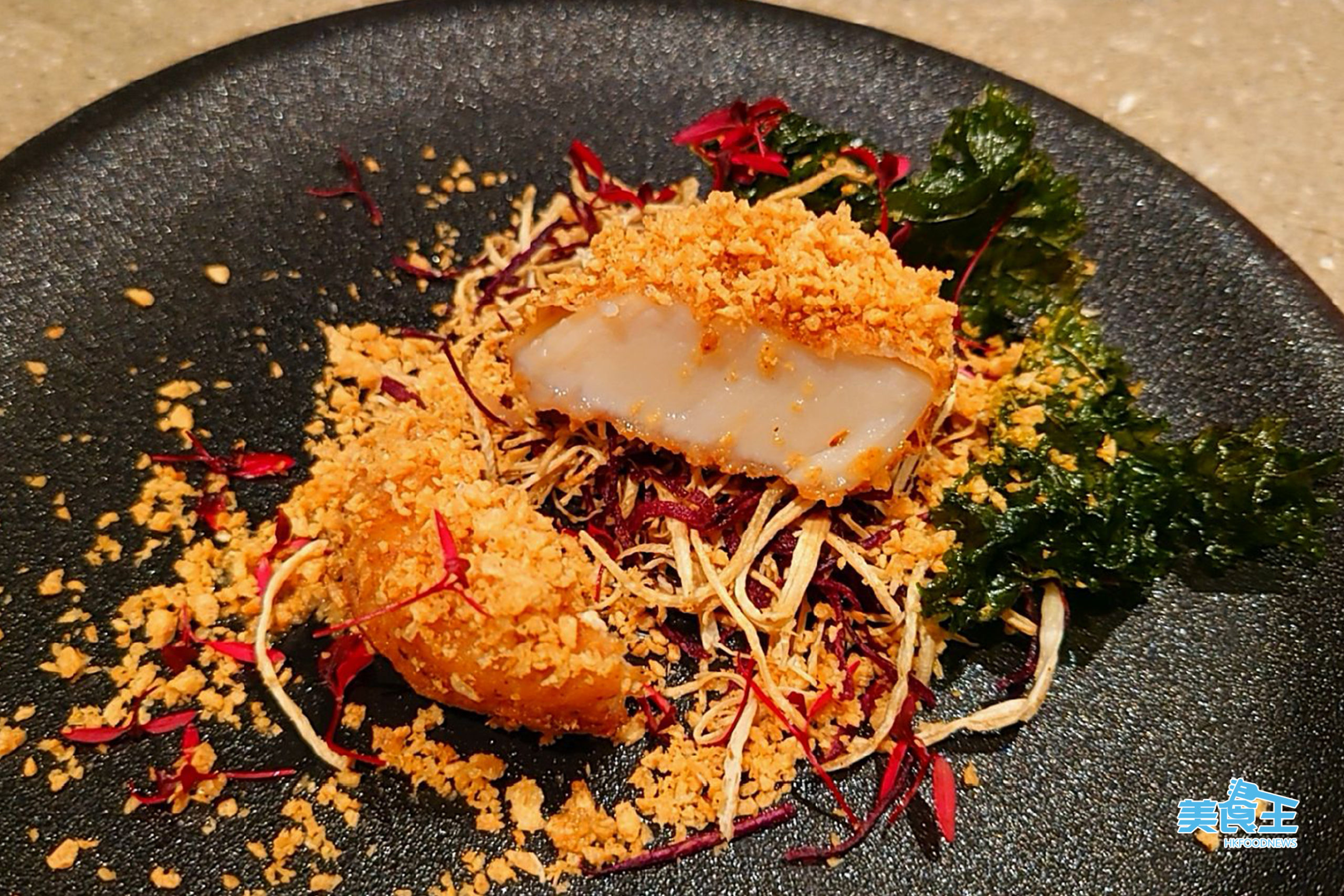 再來的是「八味金蒜北海道鮮干貝」,以低溫烹調方式保留生食級、大大隻帶子的鮮甜味,於外層裹上特製八味粉並酥炸至金黃,再撒上台式蒜酥、蕃薯脆片等,令口感與層次更為多元化。