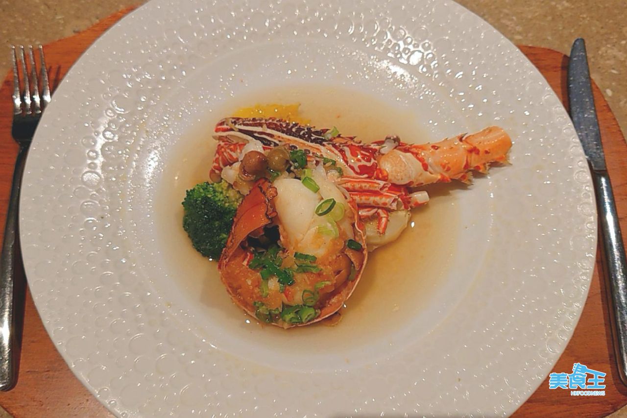 另一主菜的「樹子瓜蓉蒸龍蝦」,選用整隻活龍蝦大火清蒸保留鮮甜與彈牙肉質,以樹子、古法醃製鹹冬瓜與鳳梨增添台式特有鹹香,最後淋上龍蝦湯汁,如此精緻的台菜,在一般台灣的中菜館絕少見到,可見大廚不凡的廚藝功夫。