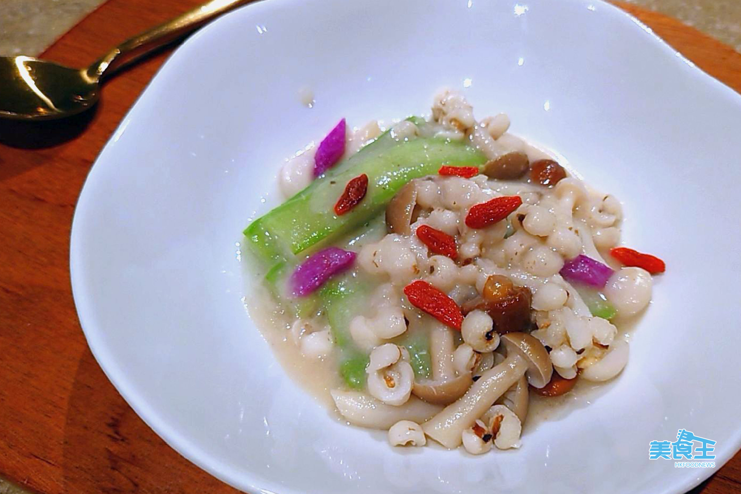 在台灣吃東西,跟香港大分別的是蔬菜量較多,這款「薏仁野菇燴絲瓜」,集多款台灣蔬菜燴製,可算是一道養生的菜式。