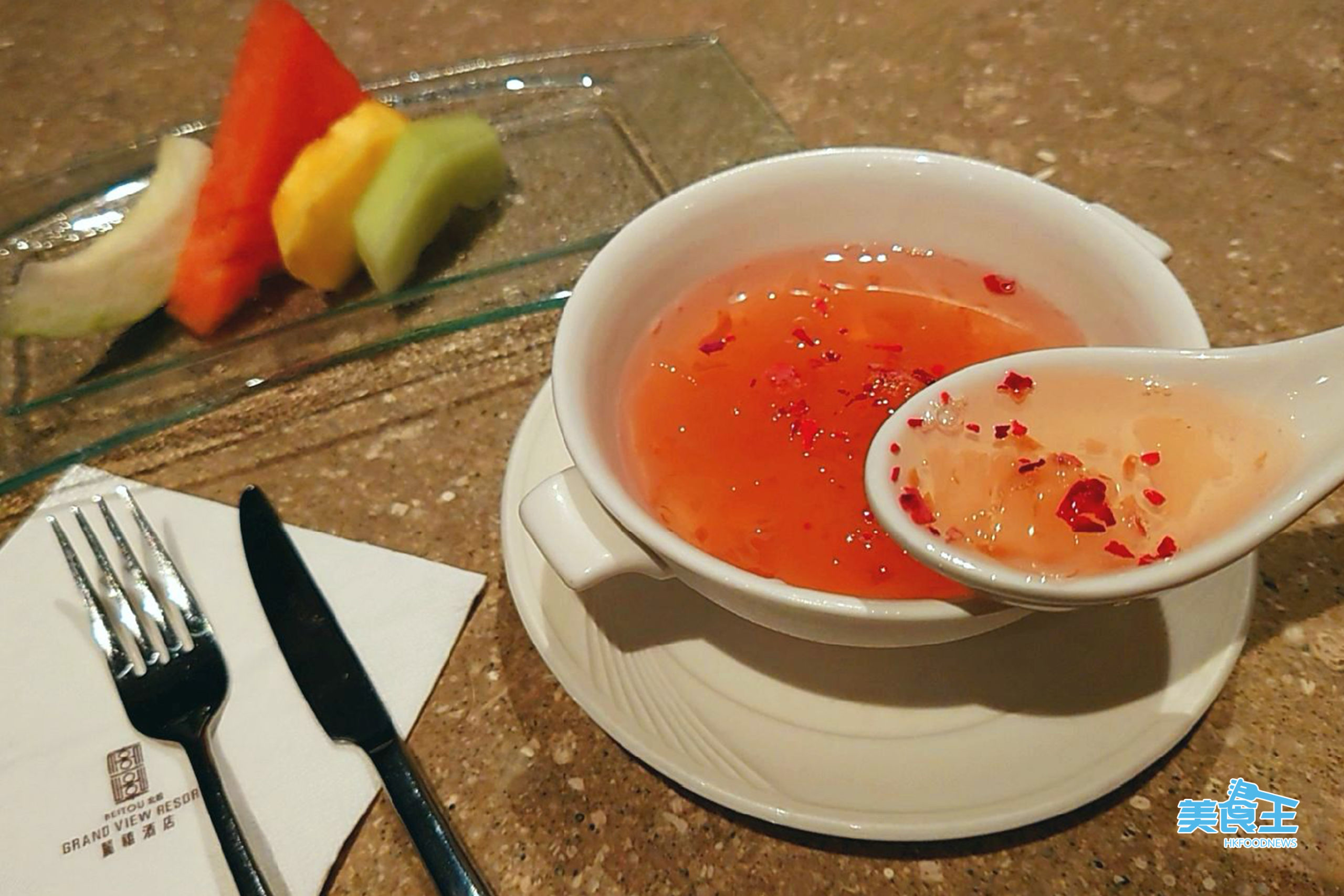 最後的小果盤是品質素有保證的台灣當地的新鮮水果,再配上採用南投的玫瑰及蘆薈粒製成的「冰糖玫瑰銀耳露」,既有視覺效果,又帶點玫瑰清香及清爽口感,細味之下還有一丁點的酸酸,原來是主廚加入檸檬汁作提味,是筆者首次吃到的甜品,確是驚喜連連!