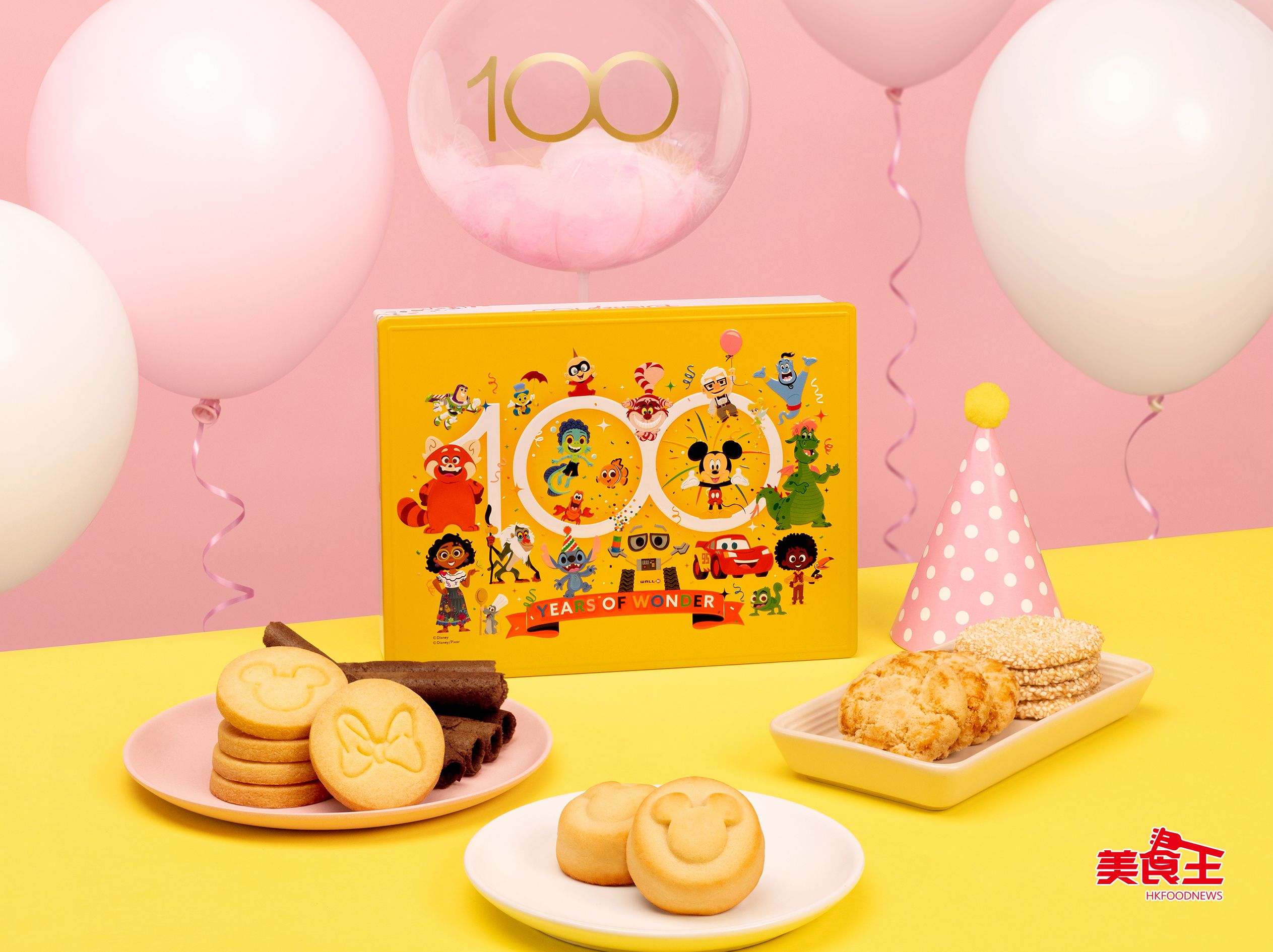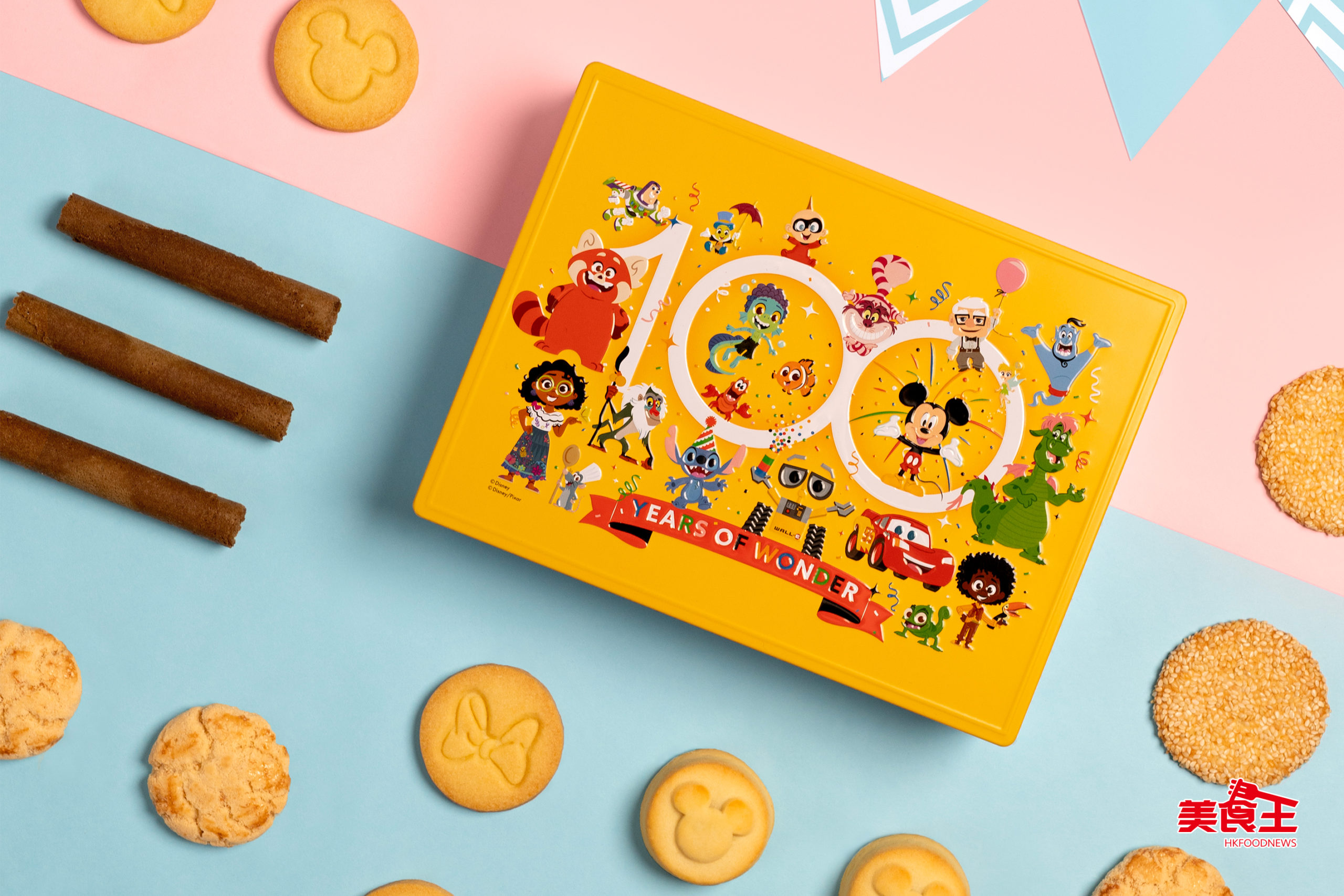 「迪士尼 100 周年系列禮盒」($108)以象徵朝氣活力的顏色作主調,並齊集超過 20 個迪士尼及彼思的角色,例如:米奇、史迪仔、機器人 WALL-E、掛著神秘微笑的妙妙貓、《海底奇兵》的Mo 仔、《反斗奇兵》的巴斯光年及抱抱龍、《反斗車王》的閃電王麥坤、《阿拉丁》的精靈、《獅子王》的狒狒長老拉飛奇等,穿插在「100」、「YEARS OF WONDER」 的字句及隨風飄動的彩炮中,跟大家一同參與迪士尼的百年慶典,締造無數歡樂回憶,同時一起享受禮盒中多款滋味小食,包括可口鬆化的「米奇鳳梨金酥」、散發濃郁牛油香的「米奇曲奇」及「米妮曲奇」、香甜酥脆的「芝麻餅」、金黃香脆的「迷你合桃酥」,以及味道香醇的「特濃朱古力蛋卷」。作為迪士尼粉絲,在品嚐美食同時,在腦海中定會浮現每個角色演出過的電影片段,實在令人回味無窮!