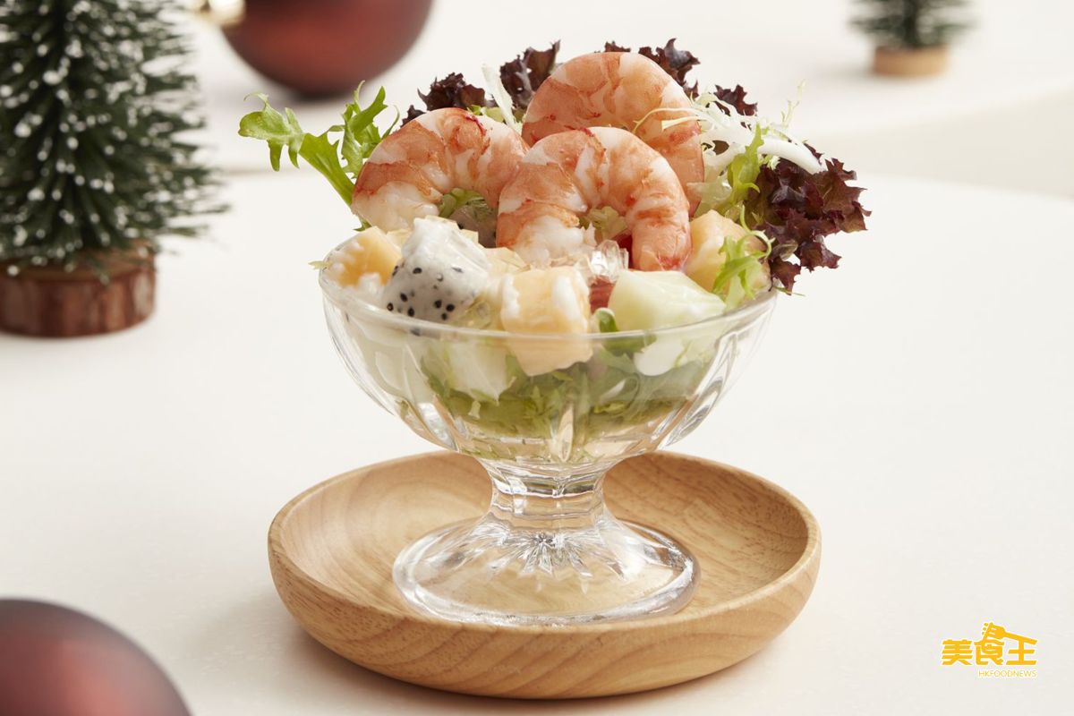 奇華茶室的聖誕晚市套餐,頭盤是「香檳鮮果蝦沙律」,採用越南虎蝦配上多款水果,是最佳的醒胃菜色。