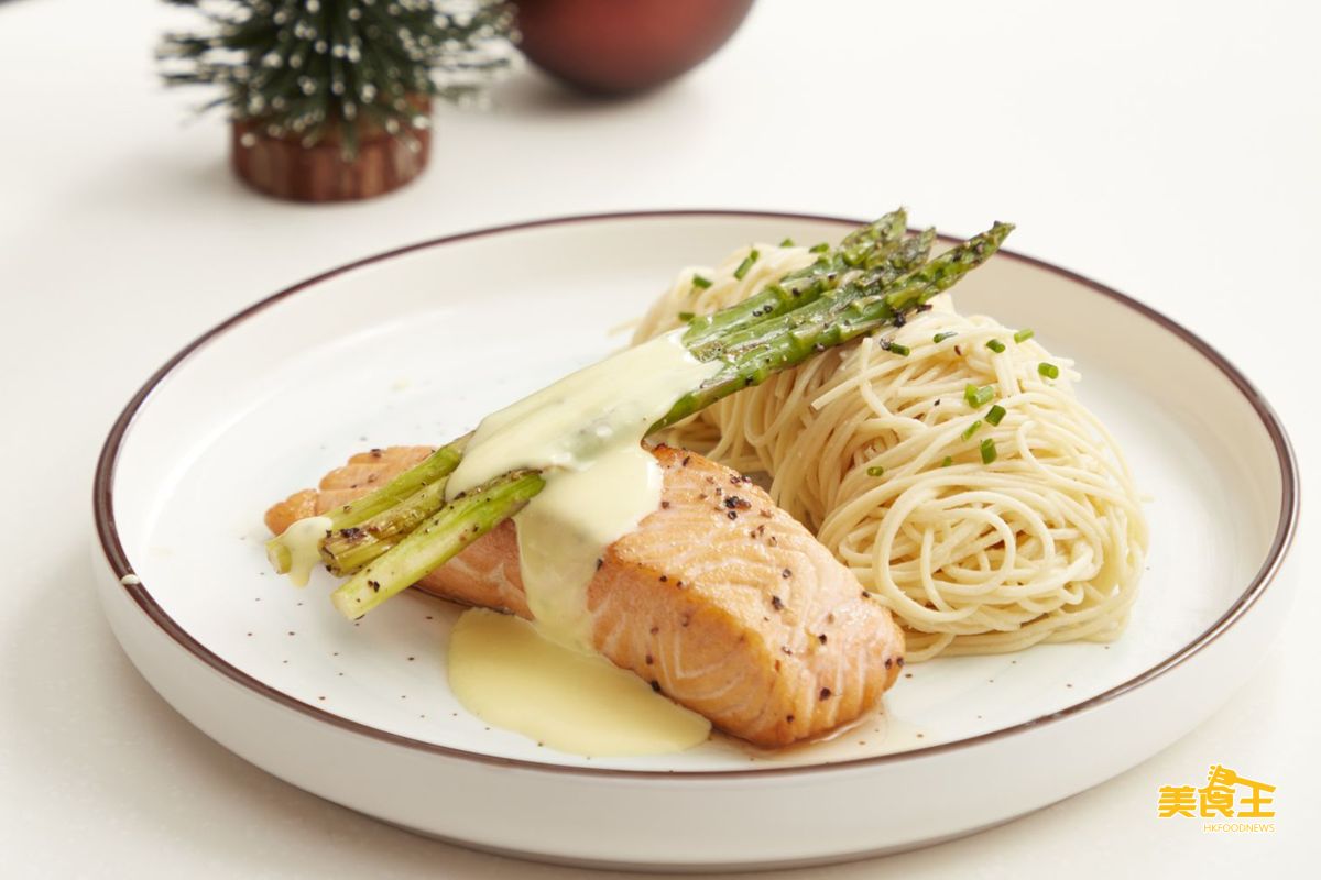 另一款主菜是「香煎三文魚柳配天使麵及忌廉汁」,先將挪威三文魚柳煎至外脆內嫩,加上以西班牙番紅花製成的忌廉汁,味道更富層次感。