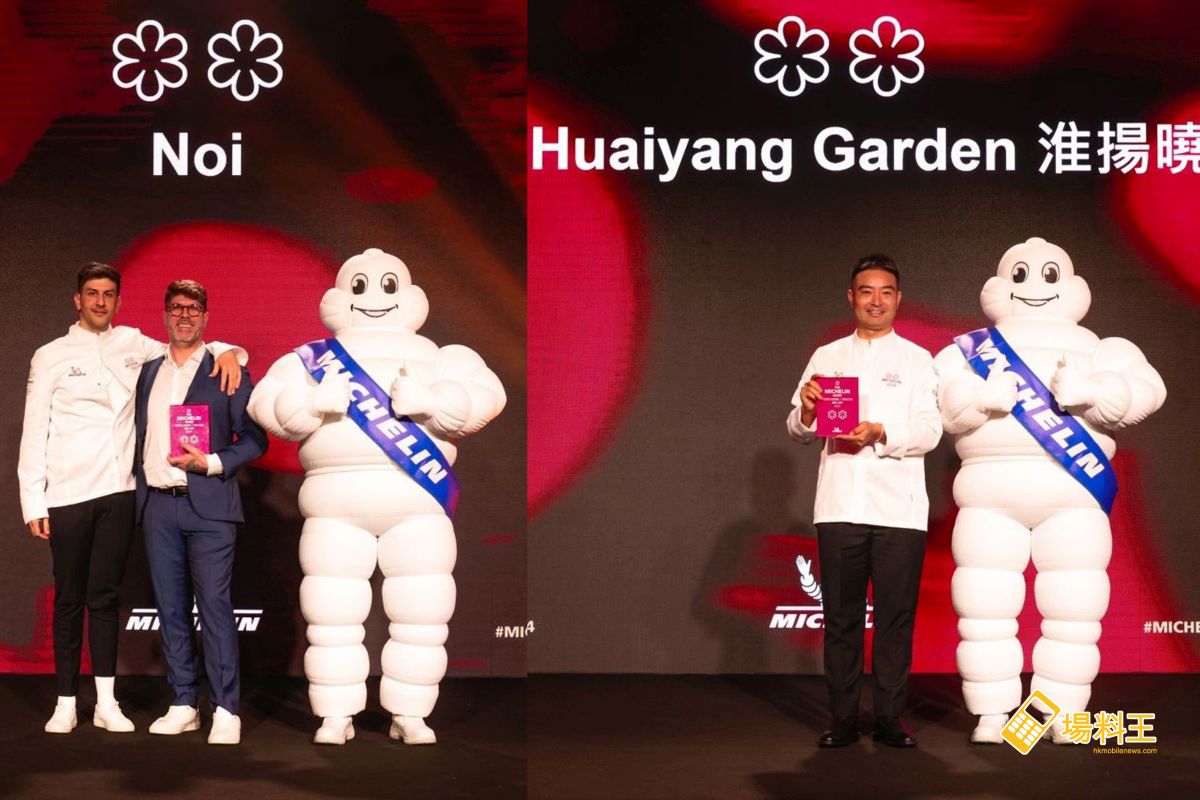 香港的 Noi 及澳門的淮揚曉宴今年由米芝蓮一星餐廳晉升為米芝蓮二星餐廳。Noi 的大廚 Paulo Airaudo 與年輕主廚 Luigi Troiano 聯手,以現代烹飪技巧呈現意式美食,逾十道菜的套餐以每天直送自日本的海鮮為主,並會根據時令,每兩三個月更換材。以北海道赤海膽配豌豆煮成的蒸蛋味道出眾,是招牌之作;炭烤藍龍蝦亦同樣出色。淮揚曉宴是《香港澳門米芝蓮指南 2024》名單中唯一專注於淮揚菜的餐廳,設計師以鏤空屏風、壁繪來仿造亮麗優雅的江南庭院。來自淮、揚、蘇地區的廚師團隊每週兩次從家鄉引進時令食材,以細膩手法展現材料的鮮味及獨特性,清風炒三蝦、香酥梁溪脆鱔及金陵鹽水鴨也是例子;甜點則不要錯過以棗泥作餡的定勝糕。