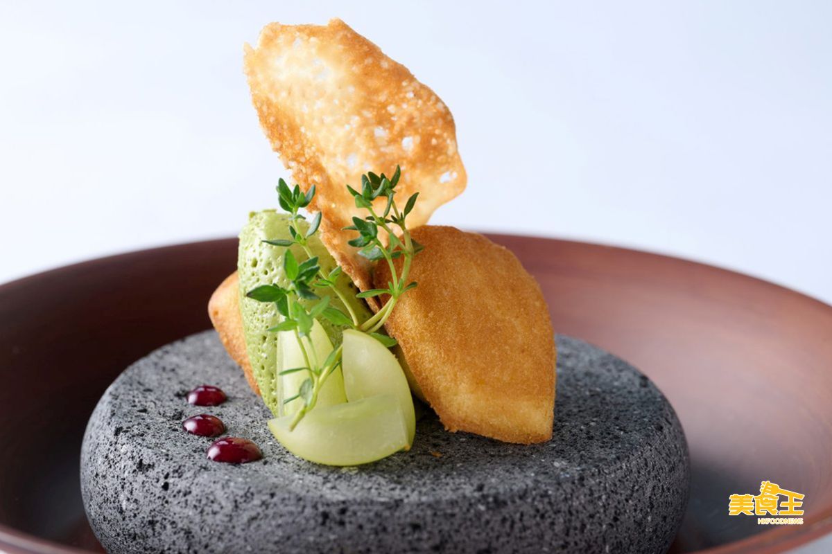 西京味噌是一種熟成時間短、鹽分較低的日本傳統調味料,將此添加在濃郁的瑪德蓮中,成了名殘 (西京味噌 抹茶 季節果醬/下圖) 中結合日式與法式元素的現代甜點。藉由融合奶油與白味噌,醞釀出發酵食材的甘甜;並佐以抹茶慕斯,抹茶的微苦滋味中和瑪德蓮的甜味,也象徵回歸會席料理的初心與紀念和食文化的源頭。