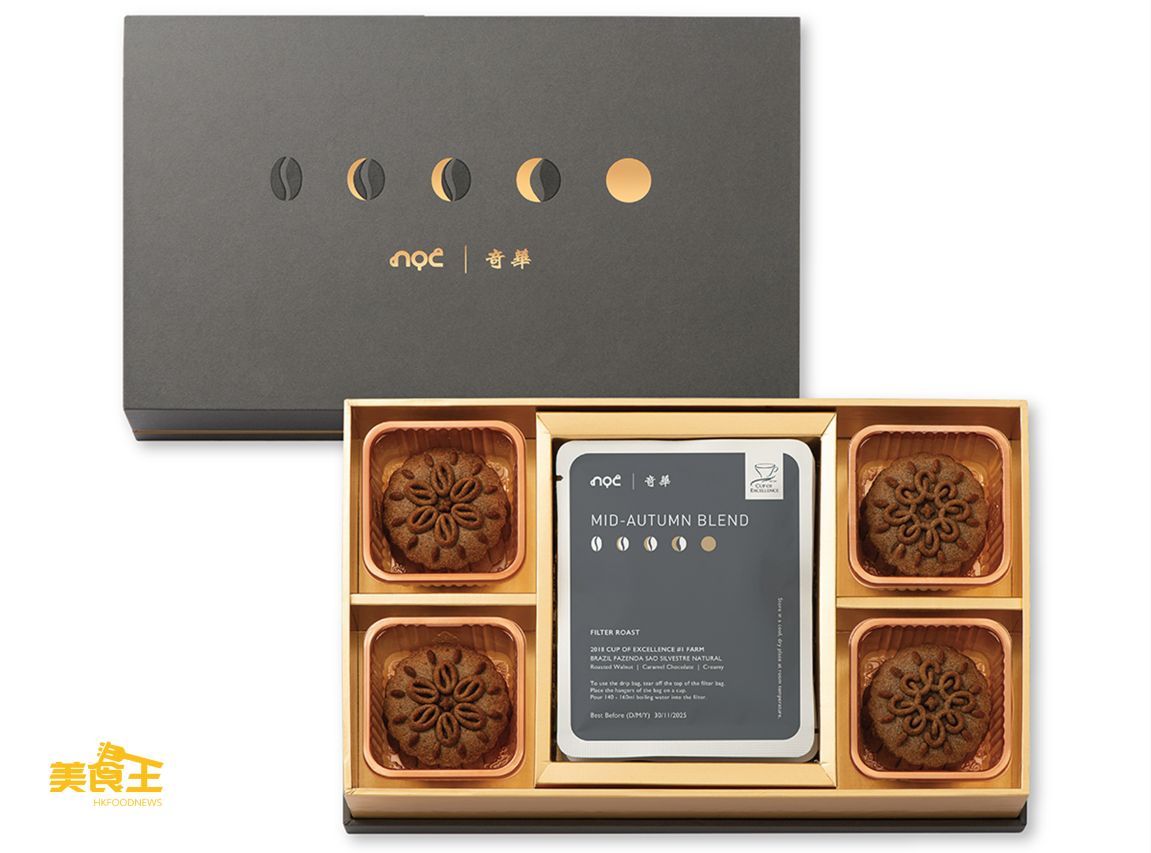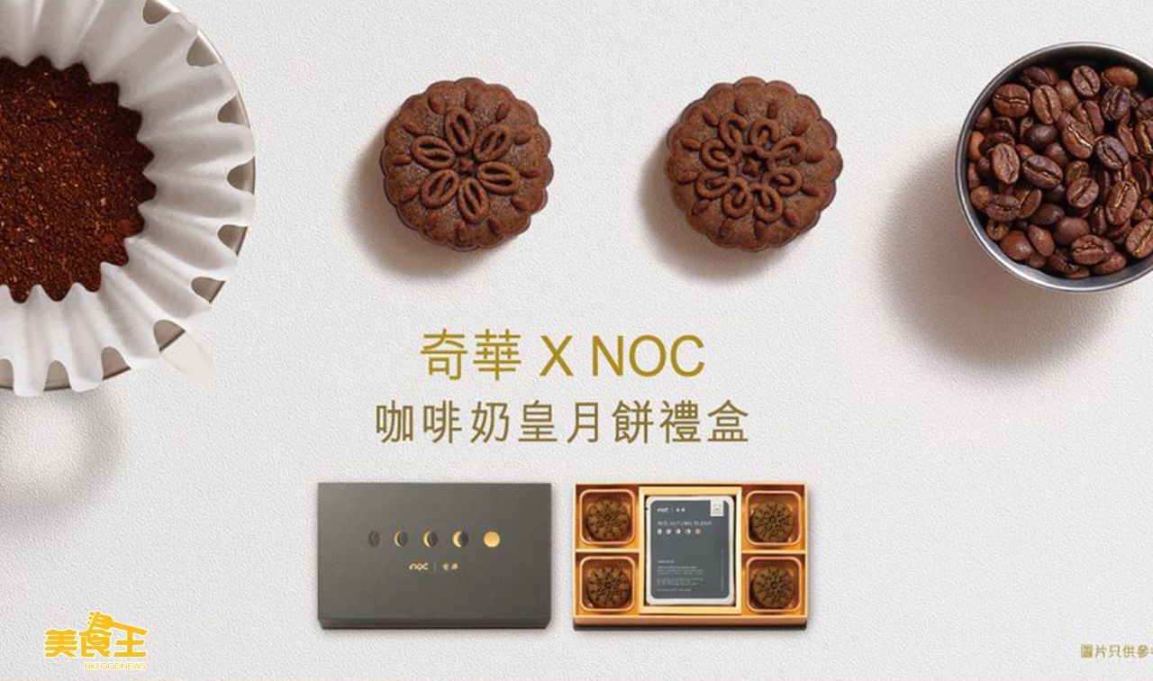 奇華餅家首度聯乘本地精品咖啡品牌 NOC Coffee Co. 推出全新的「奇華 x NOC 咖啡奶皇月餅禮盒」,禮盒設計以灰色及金色的玫麗配搭,將咖啡豆幻化成滿月的簡約禮盒,顯赫高雅。盒內載有「軟心咖啡奶皇月餅」及「軟心紅桑子奶皇月餅」各兩個,再配上 NOC 特調、獨一無二的掛耳咖啡包 (4 包)。