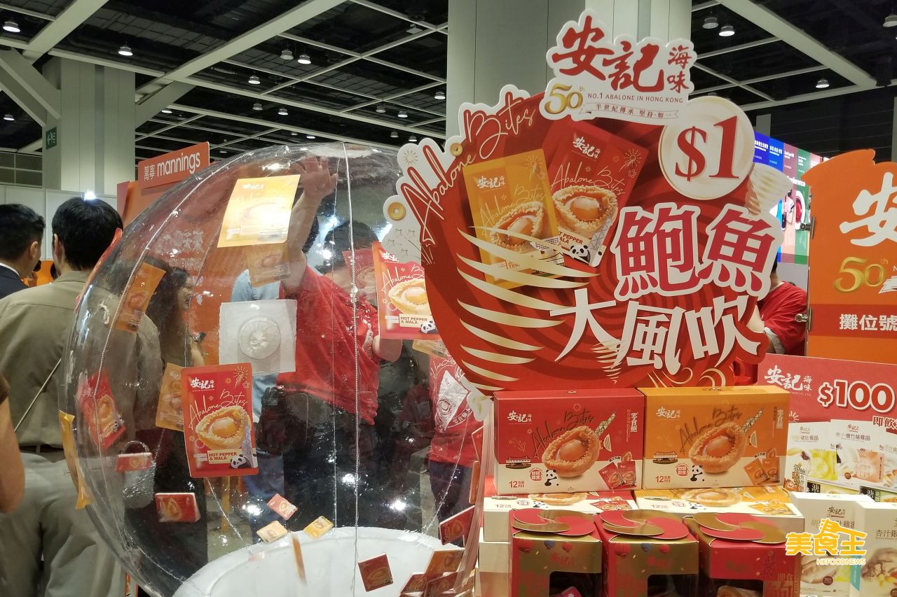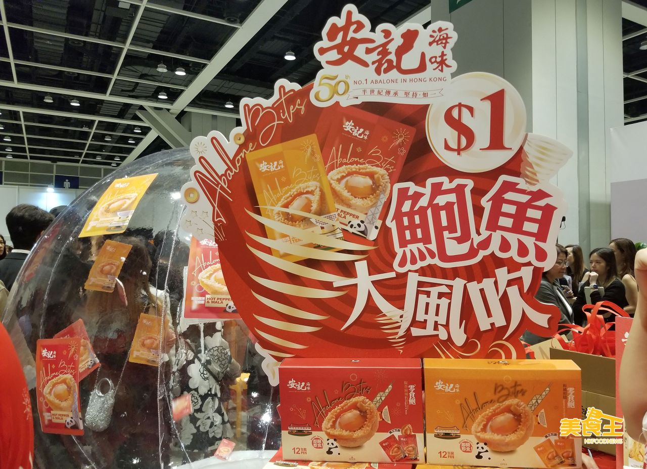 安記今年推出零食鮑魚系列,一口鮑魚小食提供和風照燒、椒香麻辣兩款味道,12 粒包裝/盒原價 $99/盒,會場價 $150/2盒。首日進場到攤位的首 9 位人士,可以 $1 參加「鮑魚大風吹」遊戲,送出共 3,888 粒即食零食鮑魚,總值 $38,880。3 人一隊進行遊戲,優勝隊伍的 3 人可各贏得 768 粒即食零食鮑魚,其他兩隊的 6 人亦可各獲 264 粒即食零食鮑魚。(安記 / 攤位:1C-B10)