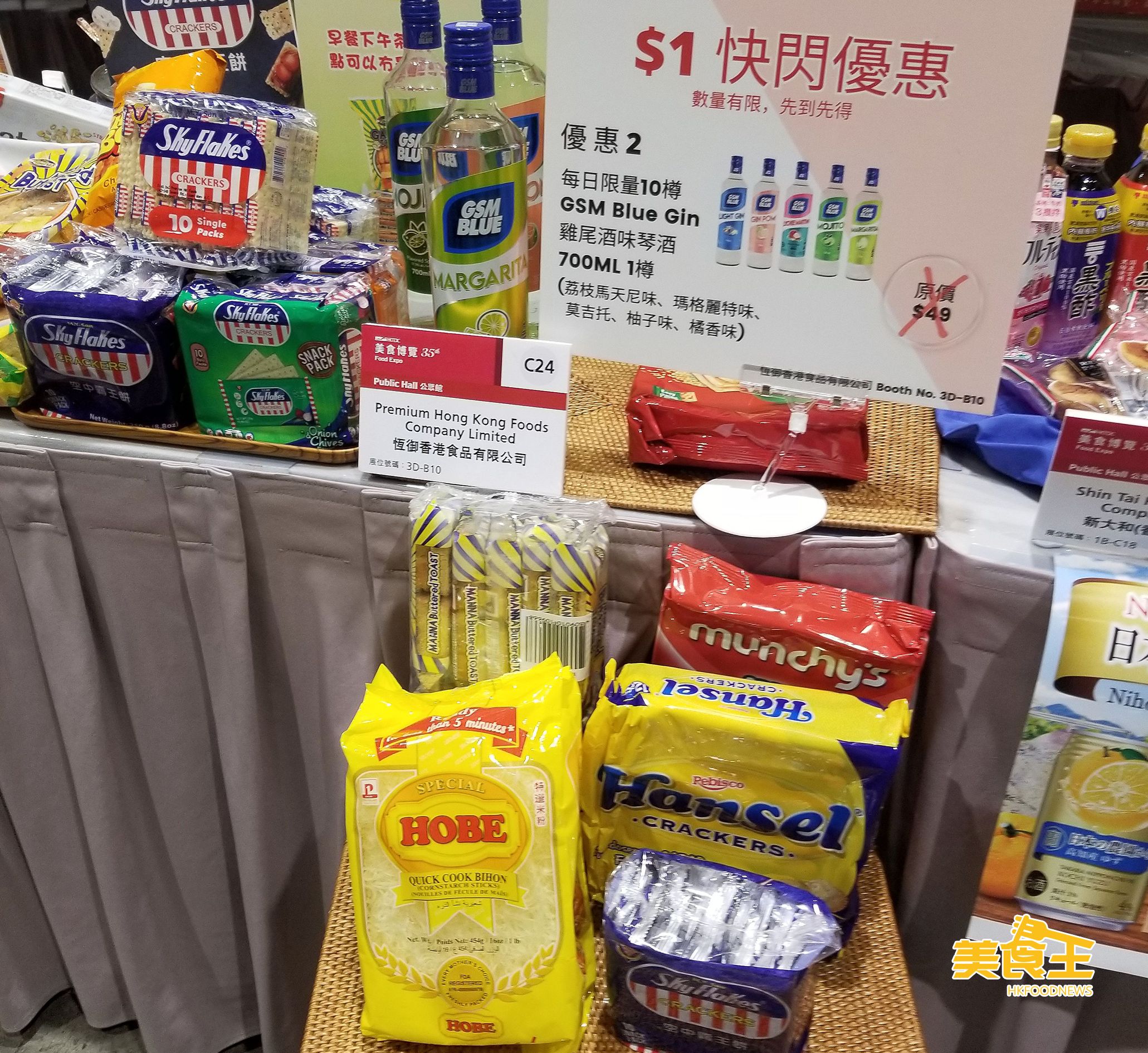 活動期間,恆御香港食品提供 $1 選購原價 $100 的食物福袋,內有 Munchy`s 餅乾、Hansel 鮮乾、Laura`s 吐司餅乾、SkyFlakes 餅乾、Hobe 粟米米粉各 1 件,每日限量 10 袋。另亦可以 $1 選購原價 $49 的 GSM Blue Gin 雞尾酒味琴酒 (700ml),每日限量 10 樽。(恆御香港食品/ 攤位:3D-B10)