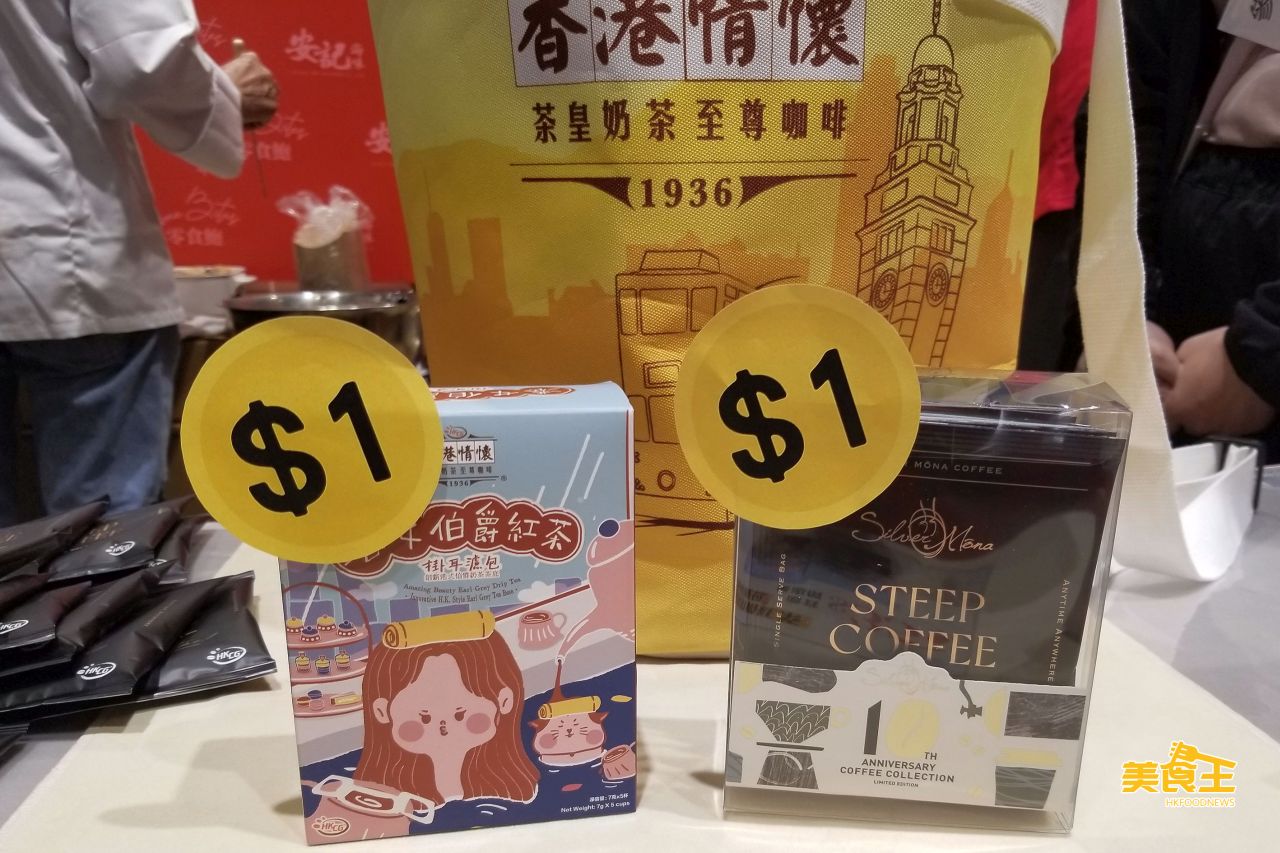 香記咖啡於活動期間可以 $1 優惠價選購原價分別 $48、$58 的香港情懷港女伯爵紅茶掛耳濾包、Silver Mona Steep Coffee 炭燒咖啡浸泡式咖啡,名額限量各 100 盒。(香記咖啡/ 攤位:1D-A12)