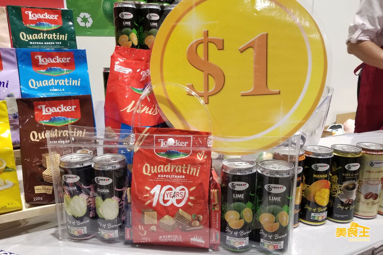 活動期間,迪斯高亦有提供 $1 選購原價 $98 的飛不甩零食大福袋,內有意大利 Loacker 粒威化餅 1 袋、馬來西亞 Sundrop 的桔仔水及石榴汁共 4 罐,每天限定 20 份。(迪斯高/ 攤位:1D-A27)
