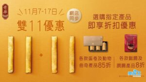 由即日起至 11 月 17 日期間,於奇華各分店或奇華網店選購蛋卷及動物曲奇產品,可享 85 折限時優惠,而選購臘腸及膶腸產品則可享 8 折限時優惠。