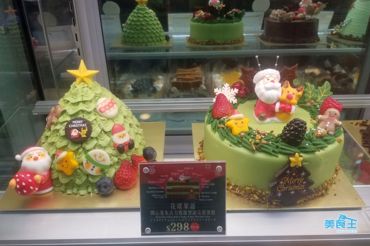 在 Italian Tomato 的 9 款聖誕蛋糕中,最吸引的算是有如星光許願樹的「聖誕杜拜朱古力開心果巴斯克芝士蛋糕」($388/14cm/下圖左),綿密香濃開心果巴斯克芝士蛋糕,夾入法國 Valrhona 朱古力 Ganache 與自家製杜拜開心果朱古力夾心,結合法國 Valrhona 朱古力海綿蛋糕與原味海綿蛋糕,配上開心果朱古力忌廉與紅桑子醬,加上以香滑開心果朱古力忌廉塑造出聖誕樹造型,打卡必選!而「開心果朱古力脆脆聖誕花環蛋糕」($298/15cm/下圖右) 內有三層綿密醇厚法國 Valrhona 朱古力蛋糕,底層夾入開心果朱古力碎脆醬,上層融入開心果朱古力忌廉、開心果吉士忌廉與紅桑子醬,酸甜清新,亦是喜歡吃朱古力及開心果人士的不錯之選。