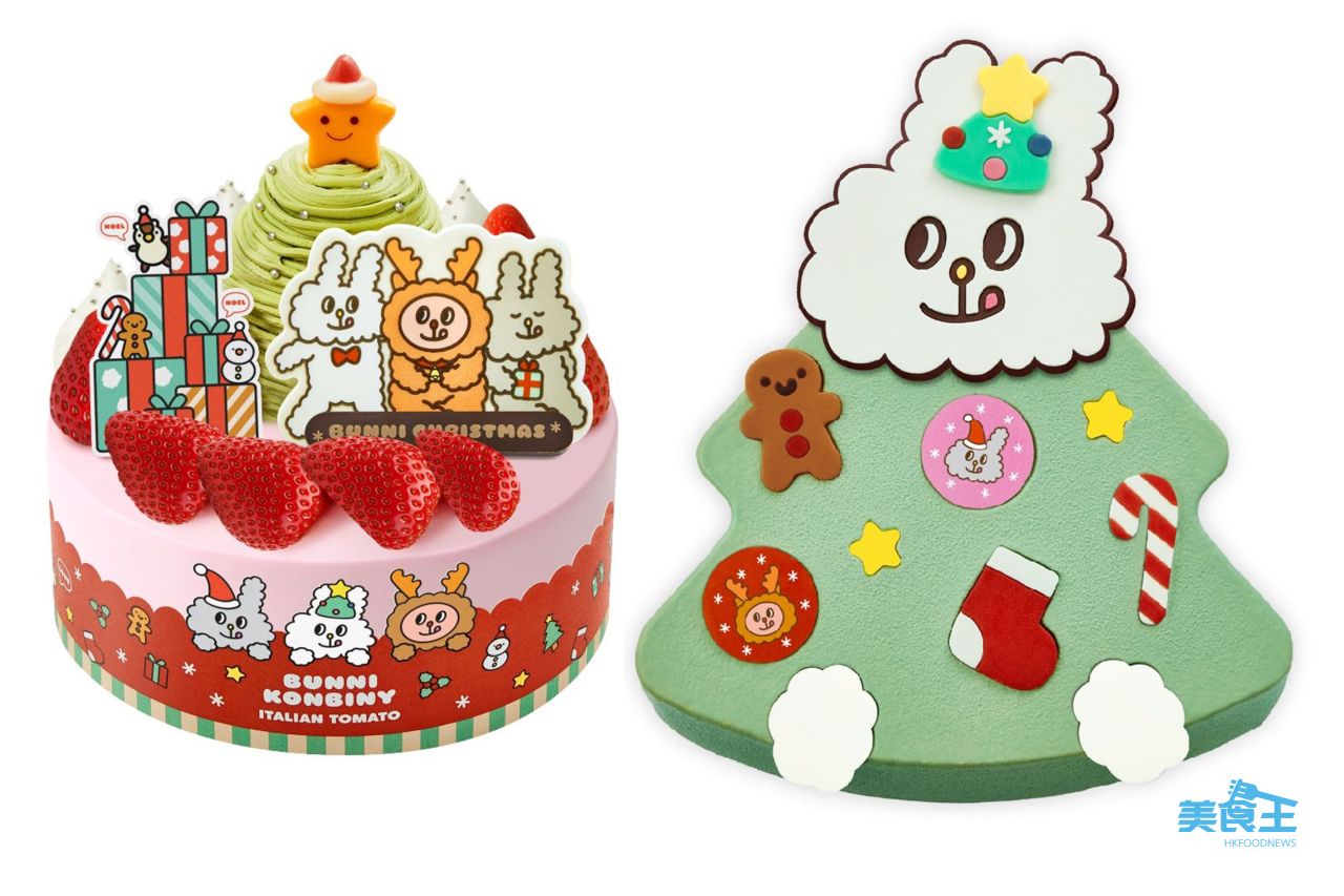 Italian Tomato 聯乘人氣角色 Bunni Konbiny 推出了 2 款限定聖誕蛋糕,分別是頂層以綿密的士多啤梨忌廉與鮮忌廉交織的「聖誕士多啤梨蛋糕」($328/15cm/下圖左),鋪滿飽滿的新鮮士多啤梨,再以 Bunni 聖誕裝飾朱古力及紙牌作點綴。Bunni身後放以開心果朱古力忌廉、紅桑子醬及原味海綿蛋糕製成的聖誕樹,下面是三層鬆軟的原味海綿蛋糕裡內藏著柔滑的士多啤梨忌廉、新鮮的士多啤梨及醇厚的士多啤梨果醬。另一款是「芒果百香果慕斯聖誕樹蛋糕」($368/約1.3磅/下圖右) 採用芒果百香果口味慕斯,並以原味海綿蛋糕夾上香甜芒果果醬,夾層間蘊藏著檸檬蛋白果仁脆脆,頂部以戴上聖誕帽的 Mayo 朱古力牌作點綴,造型得意趣緻!