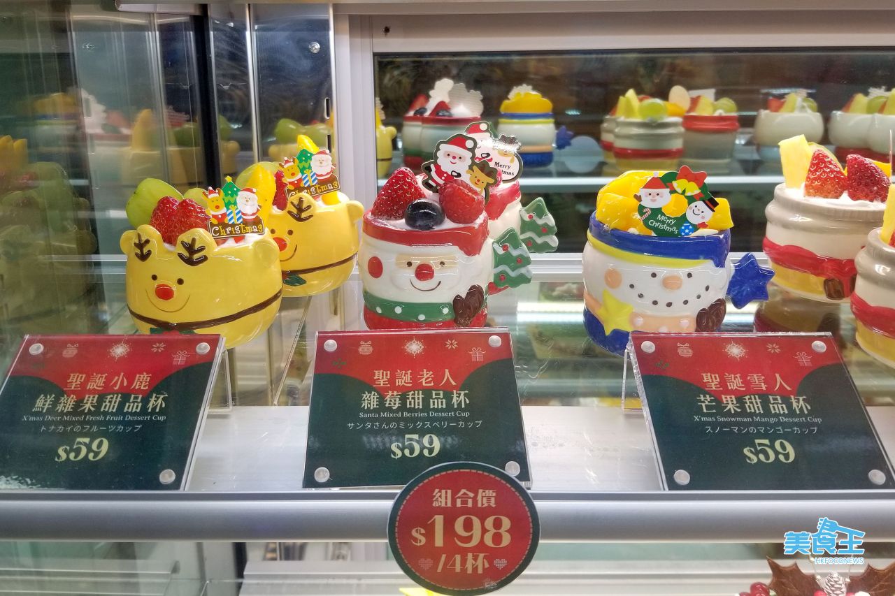 如果是人較少或作為甜品的話,甜品杯是較適合的選擇,當中造型最應節的,可選用了法國 Valrhona 朱古力海綿蛋糕配上士多啤梨忌廉和雜莓果醬的「聖誕老人雜莓甜品杯」($59/下圖中)、「聖誕小鹿鮮雜果甜品杯」($59/下圖左) 內有原味海綿蛋糕配上幼滑鮮忌廉和香桃果醬、以原味海綿蛋糕配上香甜的芒果果醬和芒果忌廉的「聖誕雪人芒果甜品杯」($59/下圖右)。