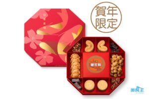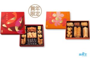另還有含多款小食的豪華聚寶錦盒 ($258 /MOP $268,下圖左),內有鬆化香酥角 4 件、歡樂笑口棗 2 包、南棗合桃糕 12 件、鳳梨金酥 1 件、香芒金酥 1 件、牛油杏仁條 6 件、牛油蝴蝶酥 6 件、老薑餅 1 包 ;而精選迎春禮盒 ($142 /MOP $152,下圖右) 則有牛油蝴蝶酥 6 件、 杏仁片朱古力曲奇 4 件、小紅莓牛油曲奇 4 件、腰果牛油曲奇 4 件、椰絲蛋白曲奇 1包、牛油蛋卷 1 包 。