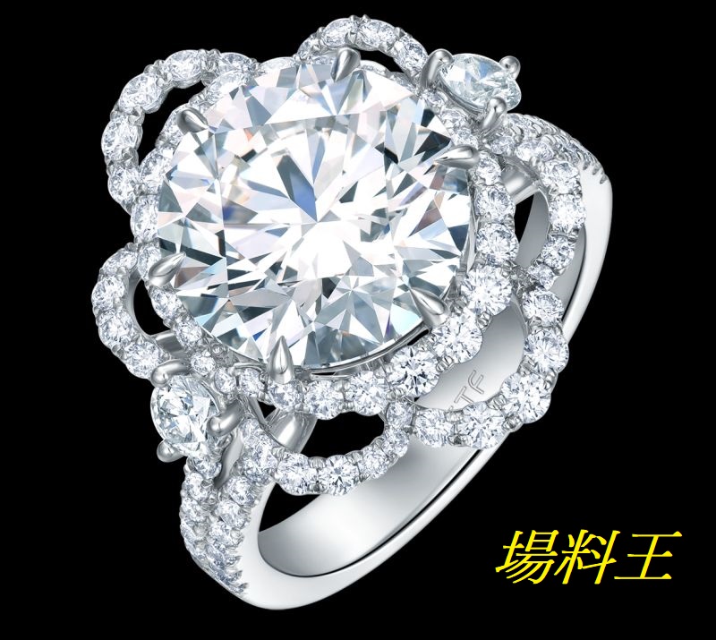 18K 白色黃金美鑽戒指 (型號:44772,售價約 $2,939,000) 的主石約重 5卡,烘托花蕊上象徵燦爛人生的 T MARK 美鑽,寄意人生經過長年累月的切割、打磨後,才會散發璀璨光芒。