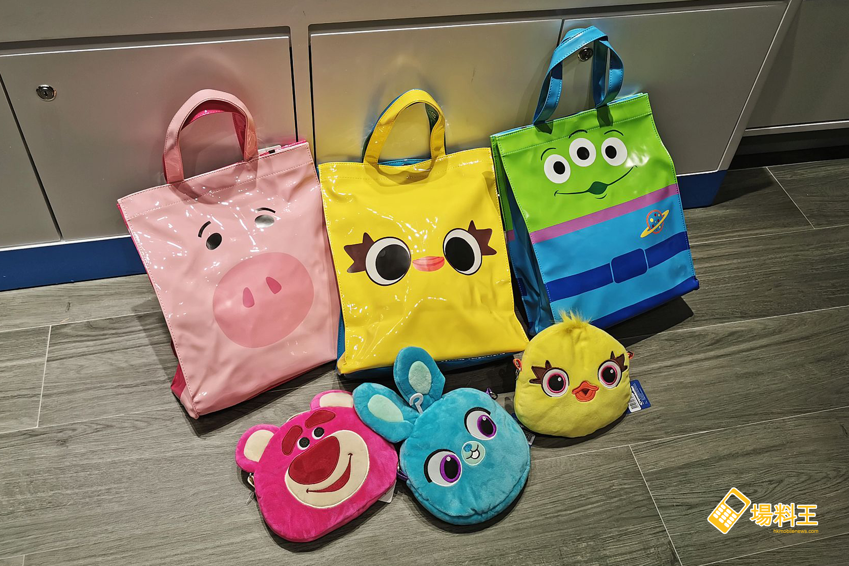採用亮面軟皮 TPU 材料製作,輕巧防水容量大,兩面印上不同顏色圖案,一個側揹袋有兩種不同風格,備有勞蘇與火腿、阿得與賓尼、三眼仔共三款圖案 (下圖上),各售 $219。
