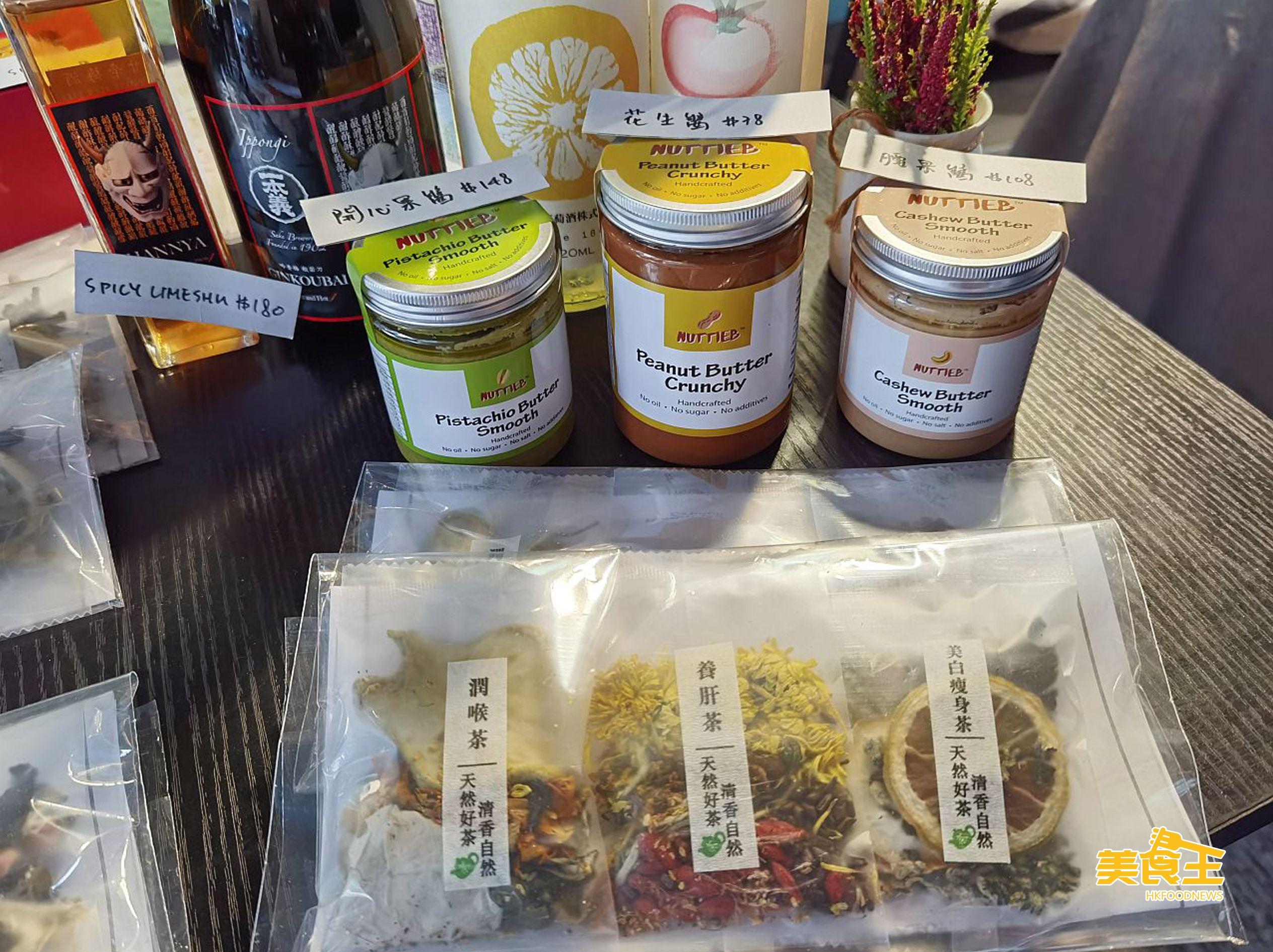 由營養師主理的手工製品本地品牌 NuttieB 採用開心果、腰果等為材料製成的多款果醬 (上圖上);具潤喉、養肝、美食瘦身等不同功效的養生花茶(上圖下)。
