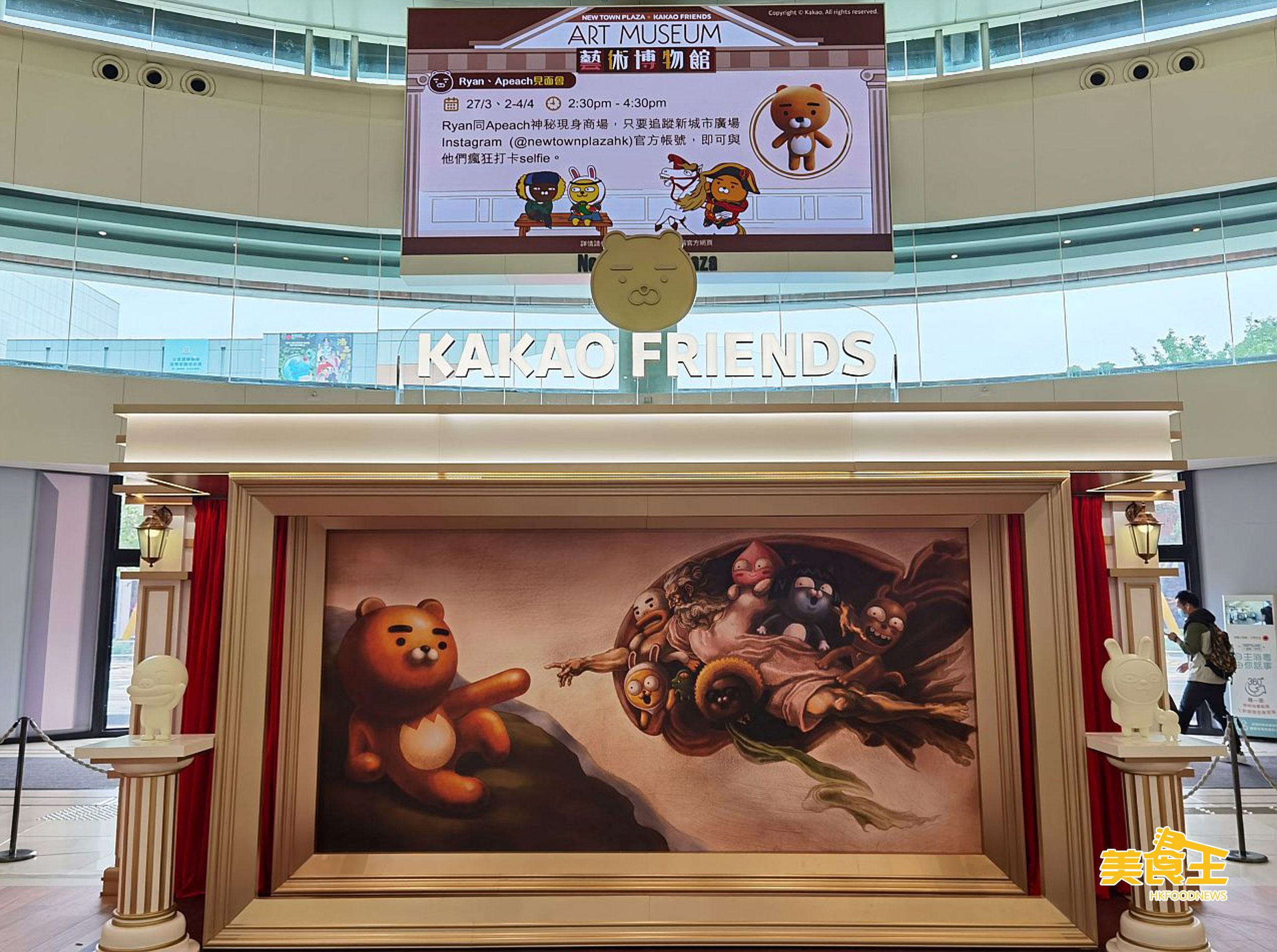 韓國另一人人熟悉的「國民卡通」Kakao Friends 跟沙田新城市廣場合作,把曾於韓國大林藝術館展出的《Musée de Kakao Friends》為設計藍圖,突破了博物館的拘謹嚴肅,讓 KakaoFriends 融入著名博物館的經典名作,於羅馬圓型獻技場位置限時設立「Kakao Friends . New Town Plaza 藝術館」,讓大家於 5 月 2 日前可一起從輕鬆有趣的角度去認識世界名畫。