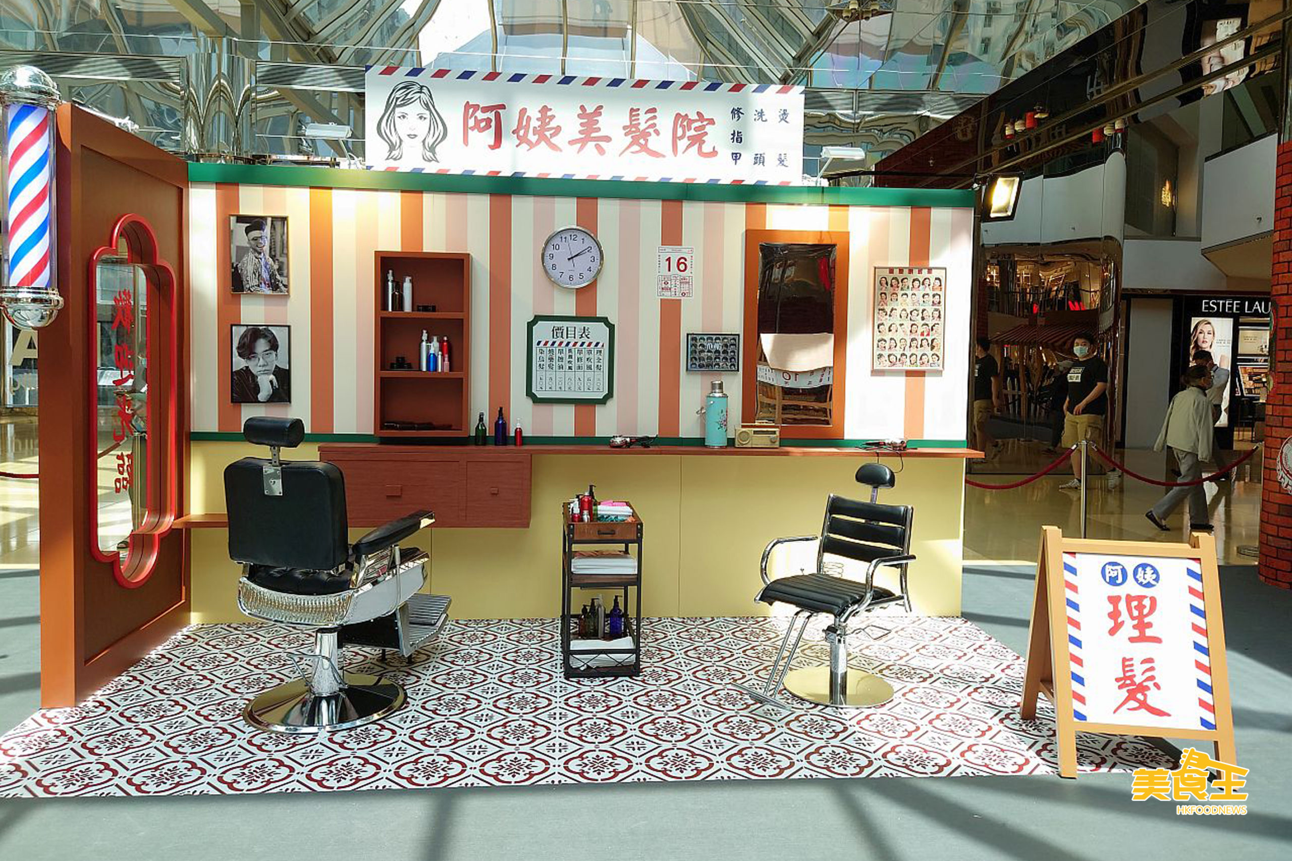至於附有紅白藍三色旋轉燈的「阿姨美髮院」,內放有舊式老上海髮型屋的理髮椅子、水銀保溫水壺、手寫價目表、古式掛牆鐘等,夠哂古式古香。
