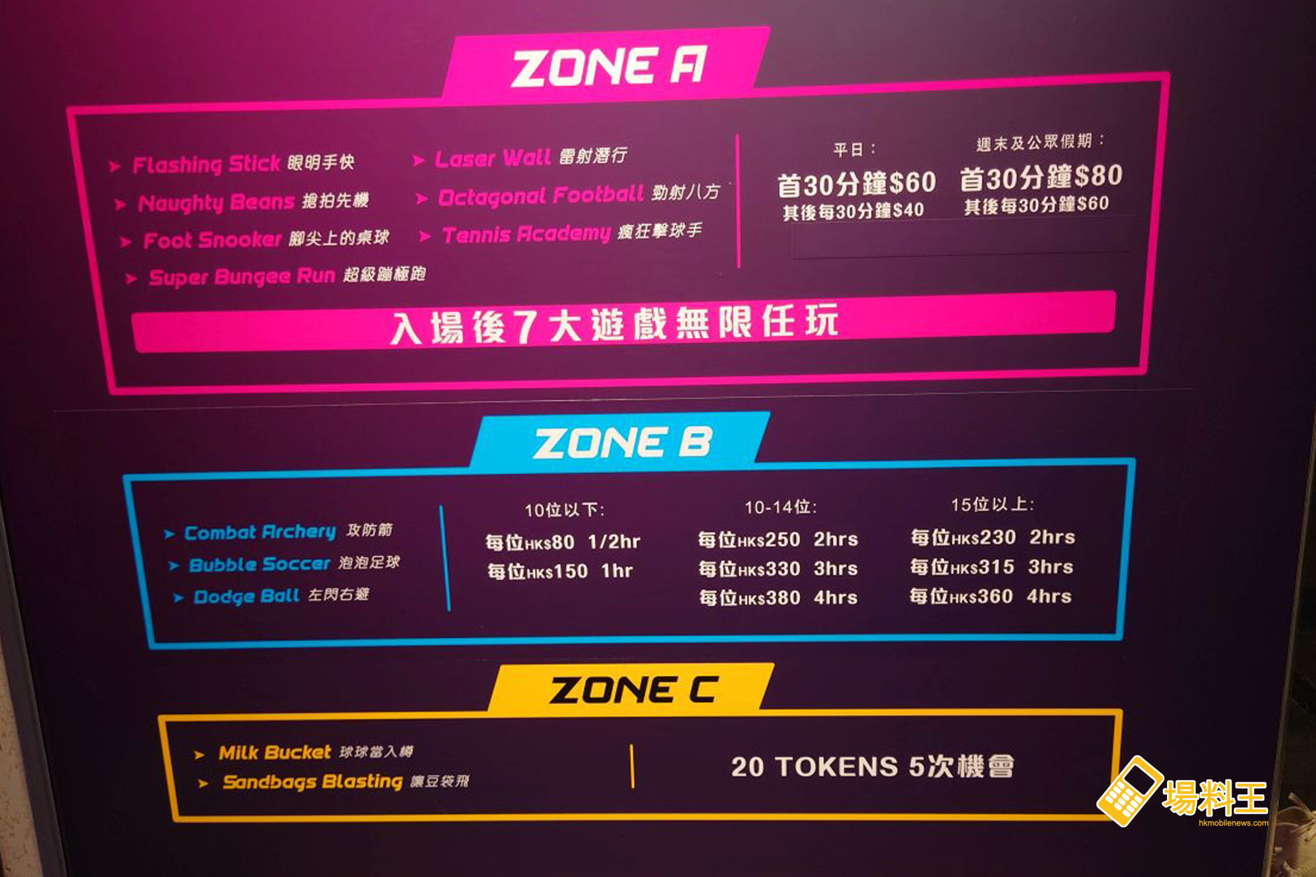 A、B 兩區都是可供多人同場進行互動遊樂的專區,並以 A 區提供的遊戲最多,共多達 7 款遊戲,而首 30 分鐘的收費為 $60/平日、$80/週末及假日,其後每 30 分鐘的收費為 $40/平日、$60/週末及假日,入場後 7 款遊戲任玩。