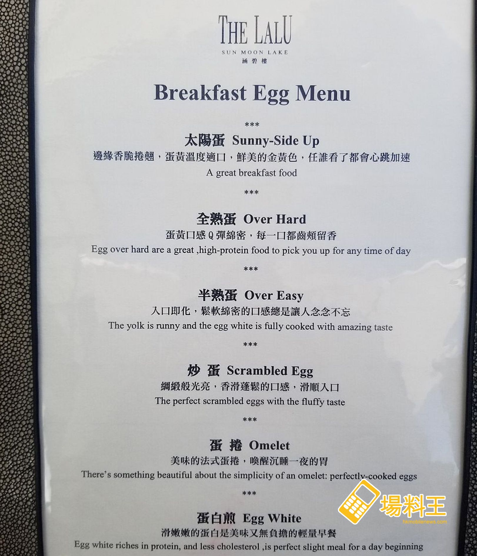 台灣人的飲食習慣之一,是他們都很愛、很常吃雞蛋,故餐廳特設一個「早餐雞蛋選單」,可餐客人點選太陽蛋、全熟蛋、半熟蛋、炒蛋、法式蛋捲、或是較健康的煎蛋白亦有提供,如果吃烚蛋的話,更有玫瑰鹽作調味,令「整件事」變得高級不少。