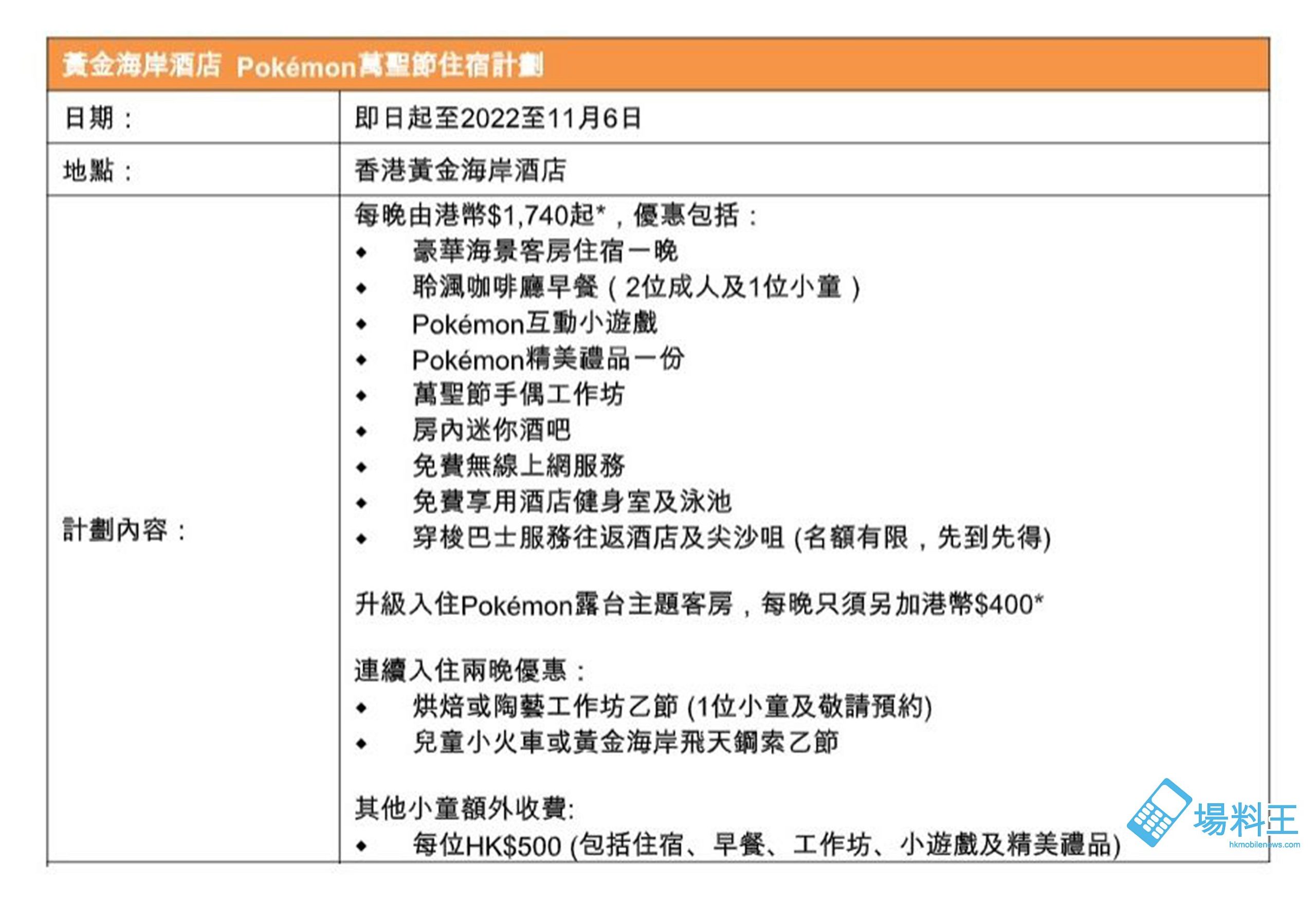 香港黃金海岸酒店精心推出「Pokémon萬聖節住宿計劃」,務求讓每位 Pokémon 粉絲投入萬聖節歷險,當中包括:入住豪華海景客房住宿一晚、享用聆渢咖啡廳早餐(2 成人 + 1 小童)、暢玩 Pokémon 主題互動小遊戲、參加萬聖節手偶工作坊,免費使用不同酒店設施等。