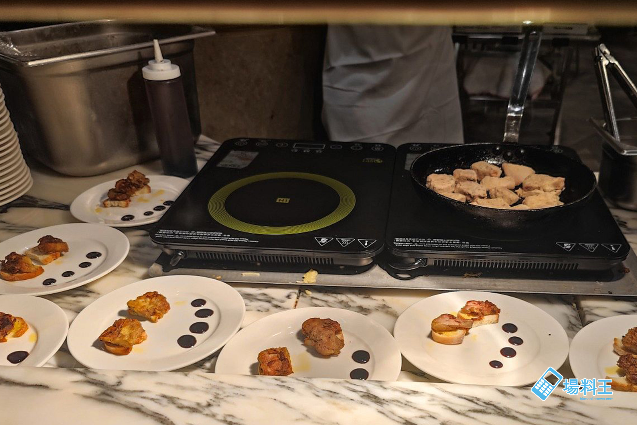 餐廳提供多款中西及國際美食,除了在廚房以外,現場也可見到部分即場烹調的菜式,如烤鴨肝多士、即切烤肉,惹味非常。