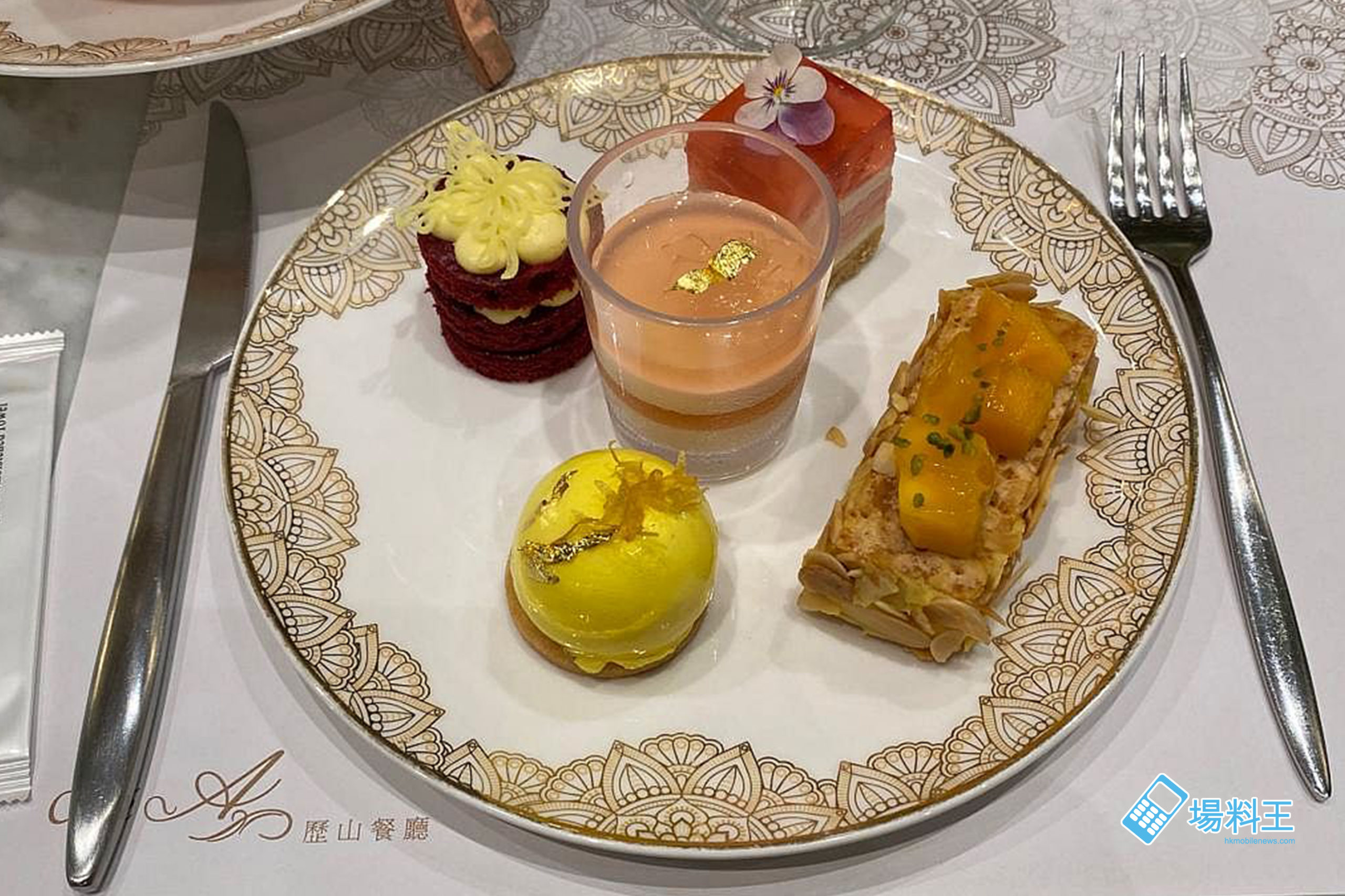 至於甜點(下圖),則有椰子奶凍、檸檬慕絲、紅絲絨蛋糕、士多啤梨芝士蛋糕、芒果拿破崙,以及英式牛油鬆餅及 Haagen-Dazs 雪糕。此外,每位還附送一杯紅酒、白酒或香檳外,還有一杯餐茶;所以份量亦頗為飽肚。