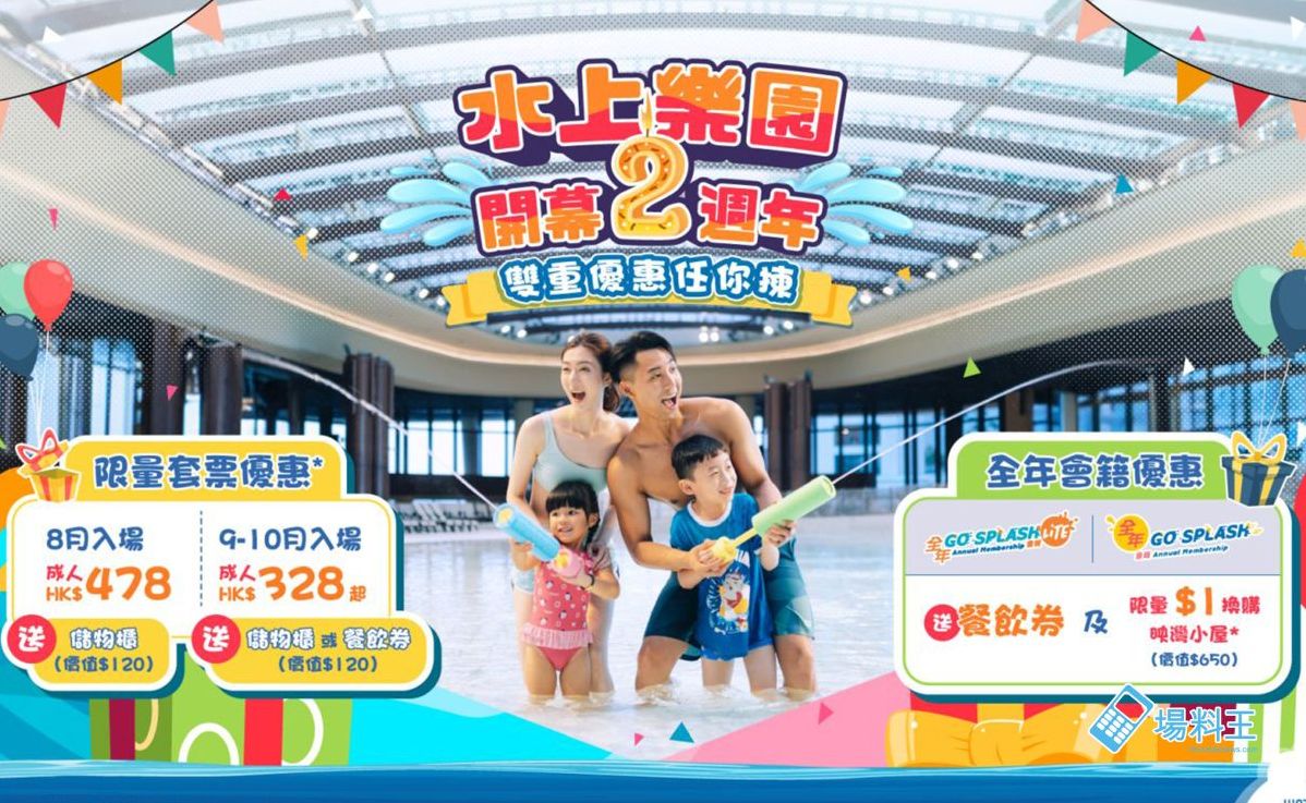 水上樂園「兩週年優惠套票」,由即日起至 2023 年 10 月 31 日以低至半價投入難忘的嘩鬼玩水派對。周末及公眾假期只需 $428,平日只需 $328,即可入園暢玩;除入場門票外,水上樂園更送出價值 $120 的免費儲物櫃服務或餐飲券,讓大家在園內享受加倍樂趣。