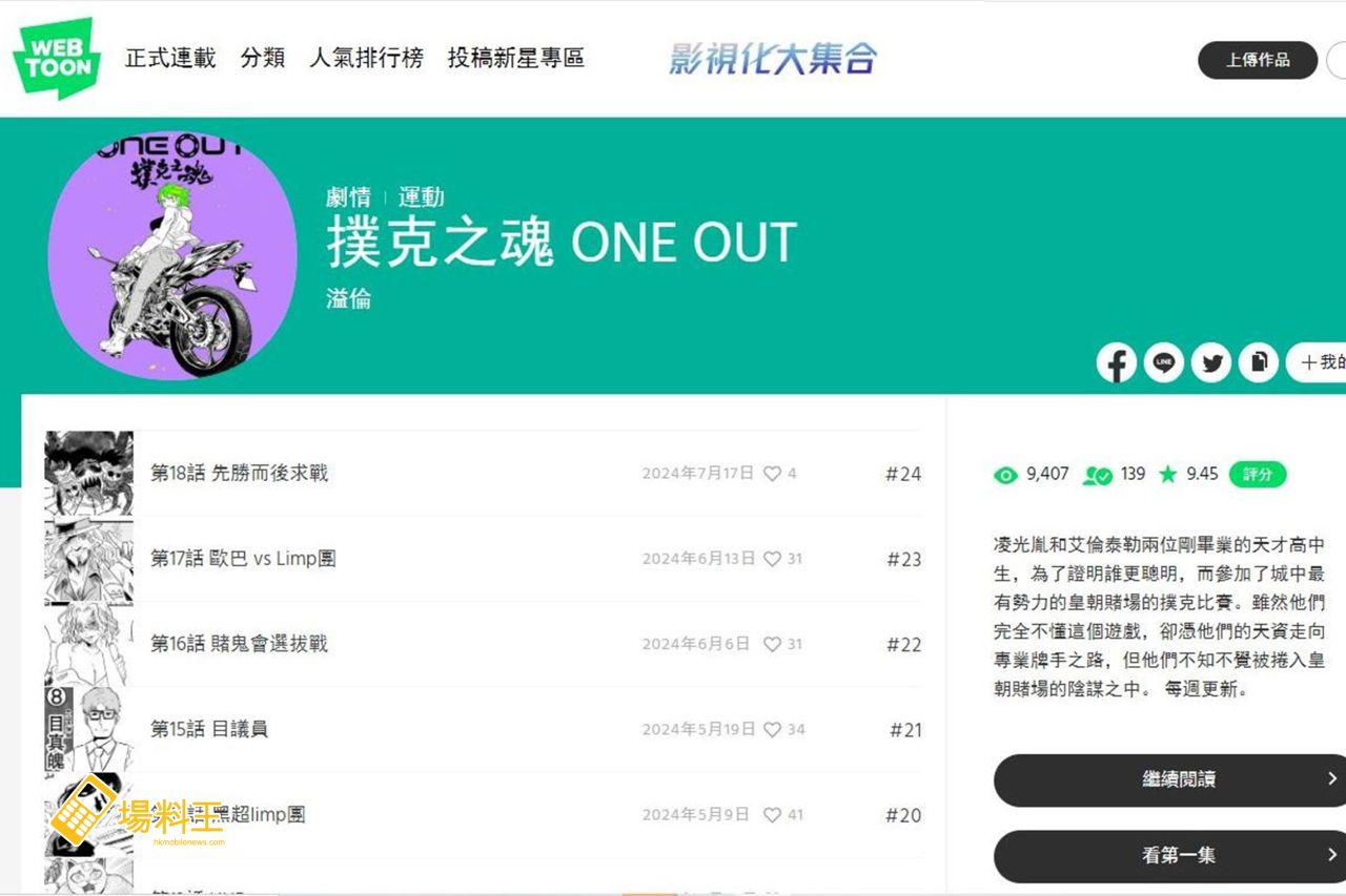 漫畫家梅溢淪的作品《撲克之魂 ONE OUT》除了於韓國的網上漫畫平台 webtoon 連載外,亦在 7 月 26-30 日的動漫展上首次亮相,攤位為 F04, F05。到時可讓大家購買到《撲克之魂》的第 1、2 集,以及其他周週產品。