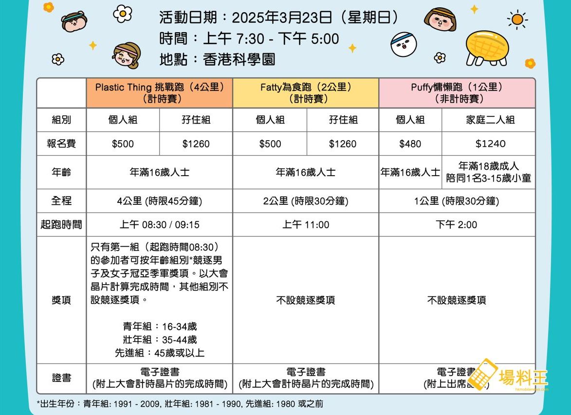 今年「PLASTIC THING RUN 2025」更設有「Plastic Thing 嘉年華」及為食妹全港首次見面聚會,Fans 們將有機會與為食妹近距離接觸!除了與各 Fans 打咭影相外,嘉年華將設有 Plastic Thing 主題遊戲攤位和表演,讓大家比賽後與親友感受嘉年華歡樂氣氛,一起度過開心好玩的一天。