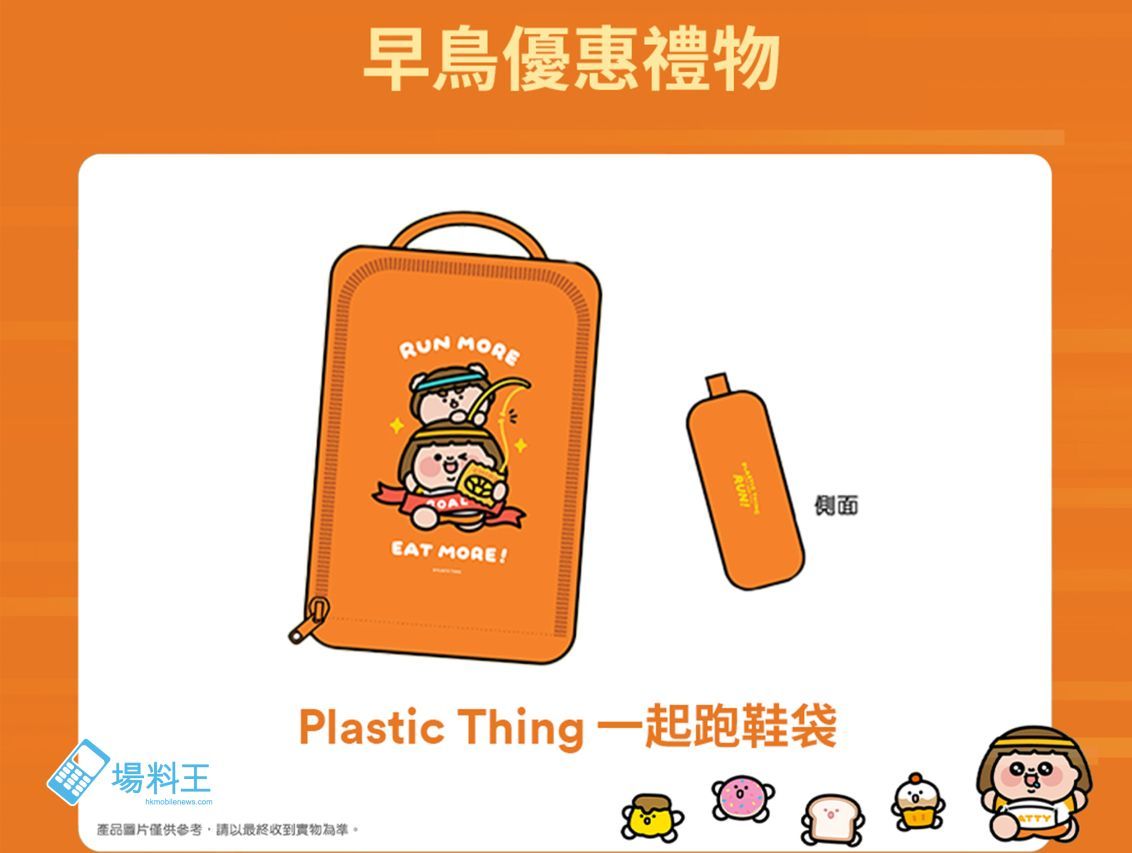 於 11 月 12 日前報名的參加者,可免費獲得早鳥限定的「Plastic Thing 一起跑鞋袋」乙個,Fans 們千萬不要錯過這個絕佳收藏機會!另外,這次聯乘活動將推出多款限量的 Plastic Thing 產品供加購,敬請大家密切留意!