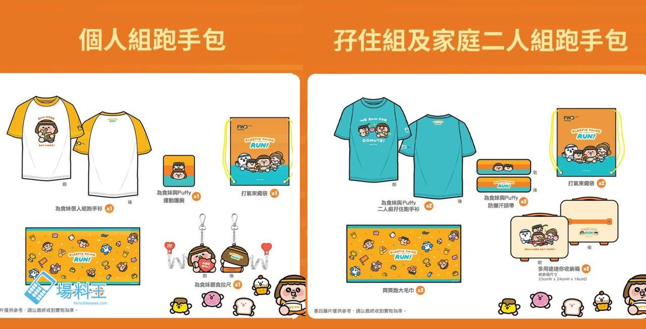 每位成功報名參加的參賽者,均可以獲得一個以 Plastic Thing 為主題的「膠」級跑手包一套,包括有活動限定的 T-shirt 1 件、齊齊跑大毛巾 1 條、打氣束繩袋 1 個及號碼布 1 塊。除以上裝備外,個人組跑手包更包含為食妹與 Puffy 運動護腕 1 件及為食妹餵食拉尺 1 把。而孖住組跑手包則有為食妹與 Puffy 防爆汗頭帶 1 條和多用途迷你收納箱 1 個,造型十分可愛!迷你收納箱用途廣泛,不但可收藏心愛的為食妹和好友的產品,亦可於旅行時攜帶,超值又實用!