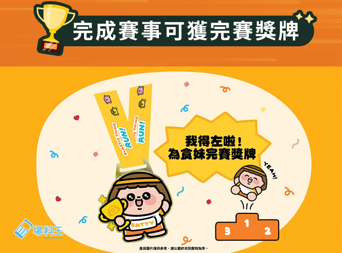 在完成賽事後,每位跑手均會獲得完賽電子證書及「為食妹我得左啦!完賽獎牌」,大會更特設獎牌刻名服務,讓大家在完成挑戰後,記住與 Plastic Thing 一起奔跑的樂趣!