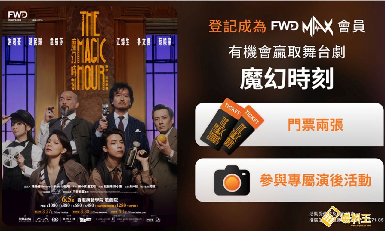 想輕鬆免費睇好劇兼有機會同演員合照?FWD富衛保險作為《魔幻時刻》的贊助夥伴,特別預留免費門票及安排了專屬活動,大家只需由即日起至 5 月 15 日網上免費登記成為 FWD MAX 會員,即可參加抽獎贏取門票 2 張,其中大獎幸運兒更可獲得額外驚喜,參與「走進魔幻一刻」專屬演後活動,有機會與劇中演員合照!劇中演員更特別攪鬼地拍攝了一段短片,加上更多海報拍攝花絮,「吹雞」叫大家一齊登記成為 FWD MAX 會員參加抽獎,免費睇好劇影靚相!
